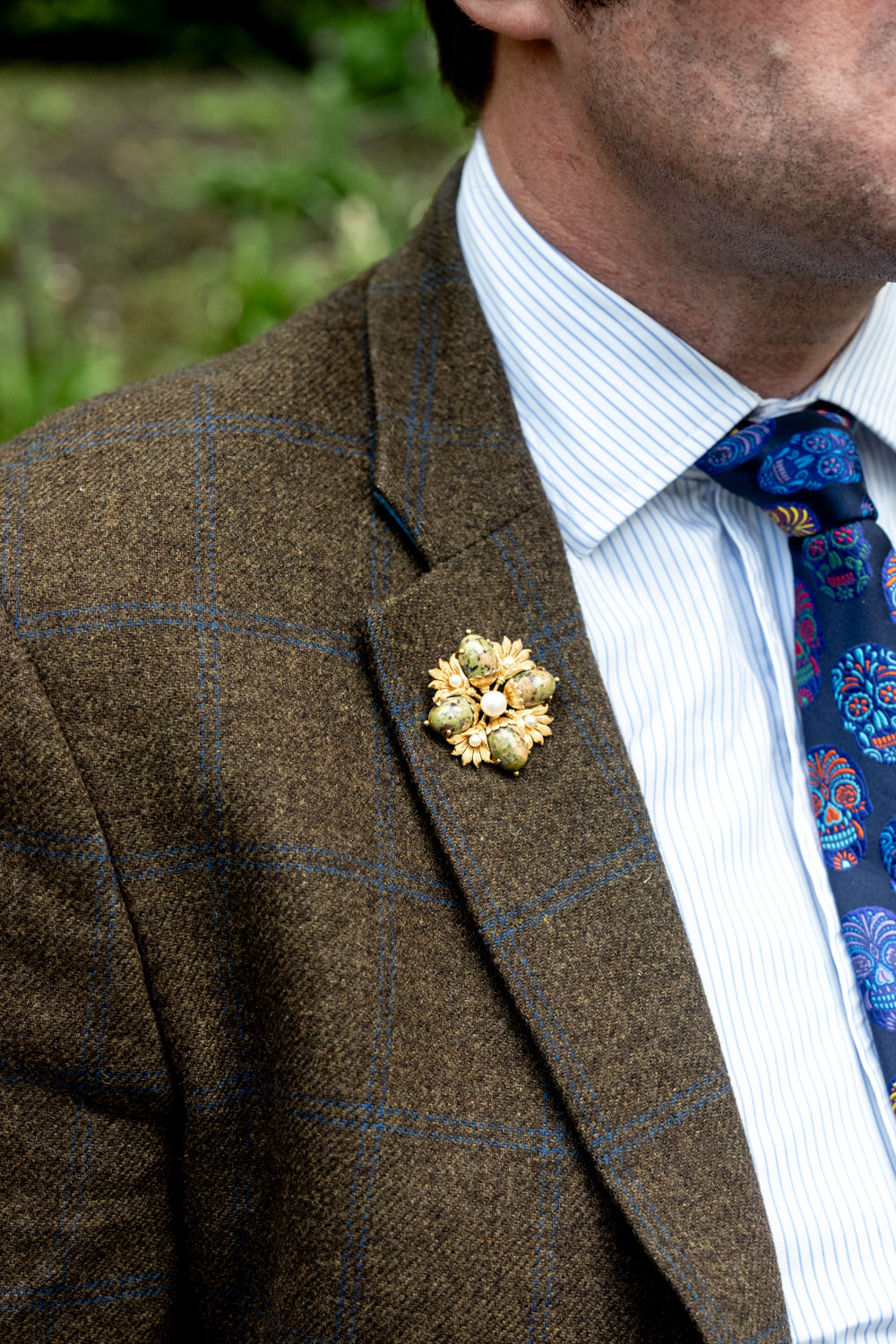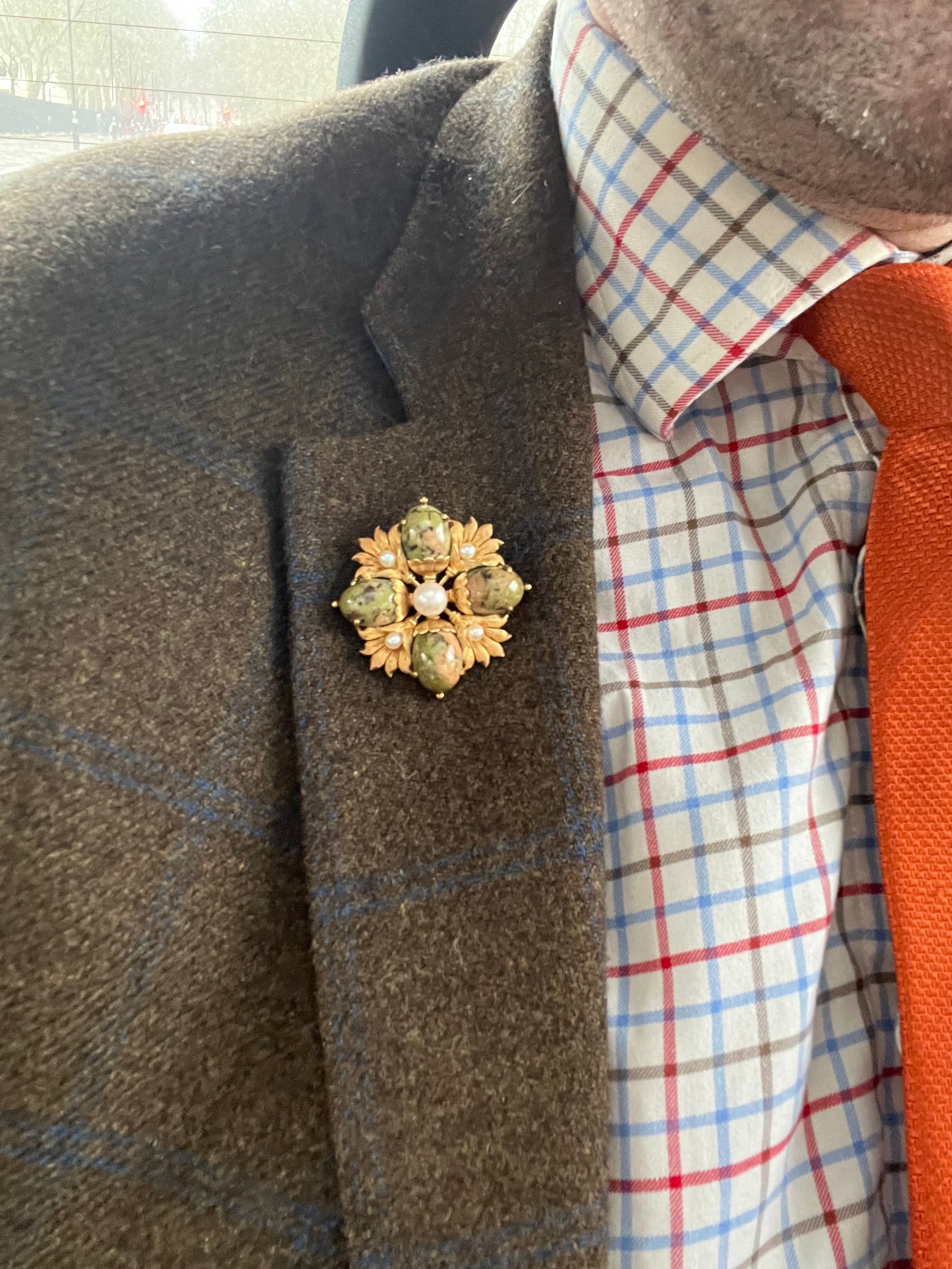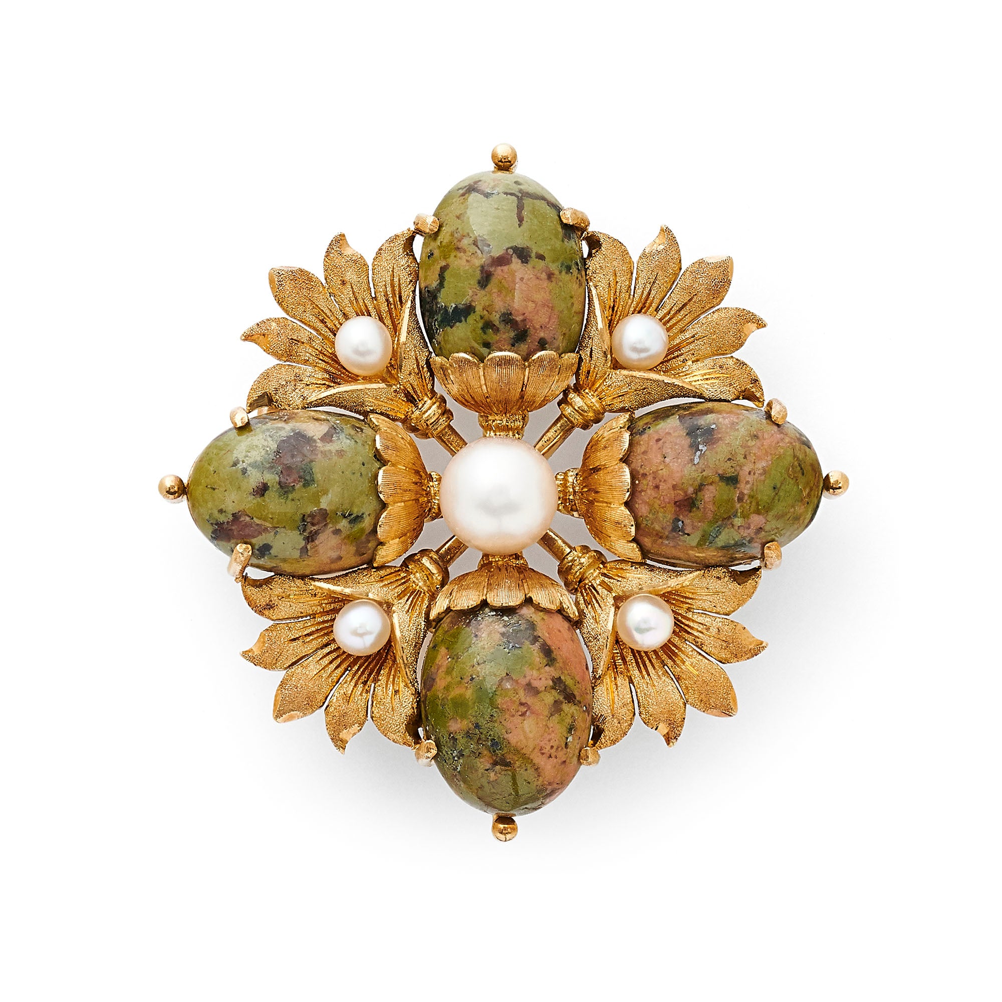 This delightful quatrefoil brooch features four serpentine agates with gold caps, resembling acorns. In the center is a larger cultured pearl, surrounded by four pearls set into each of the floral motifs. Carefully designed by Minotto in Italy.