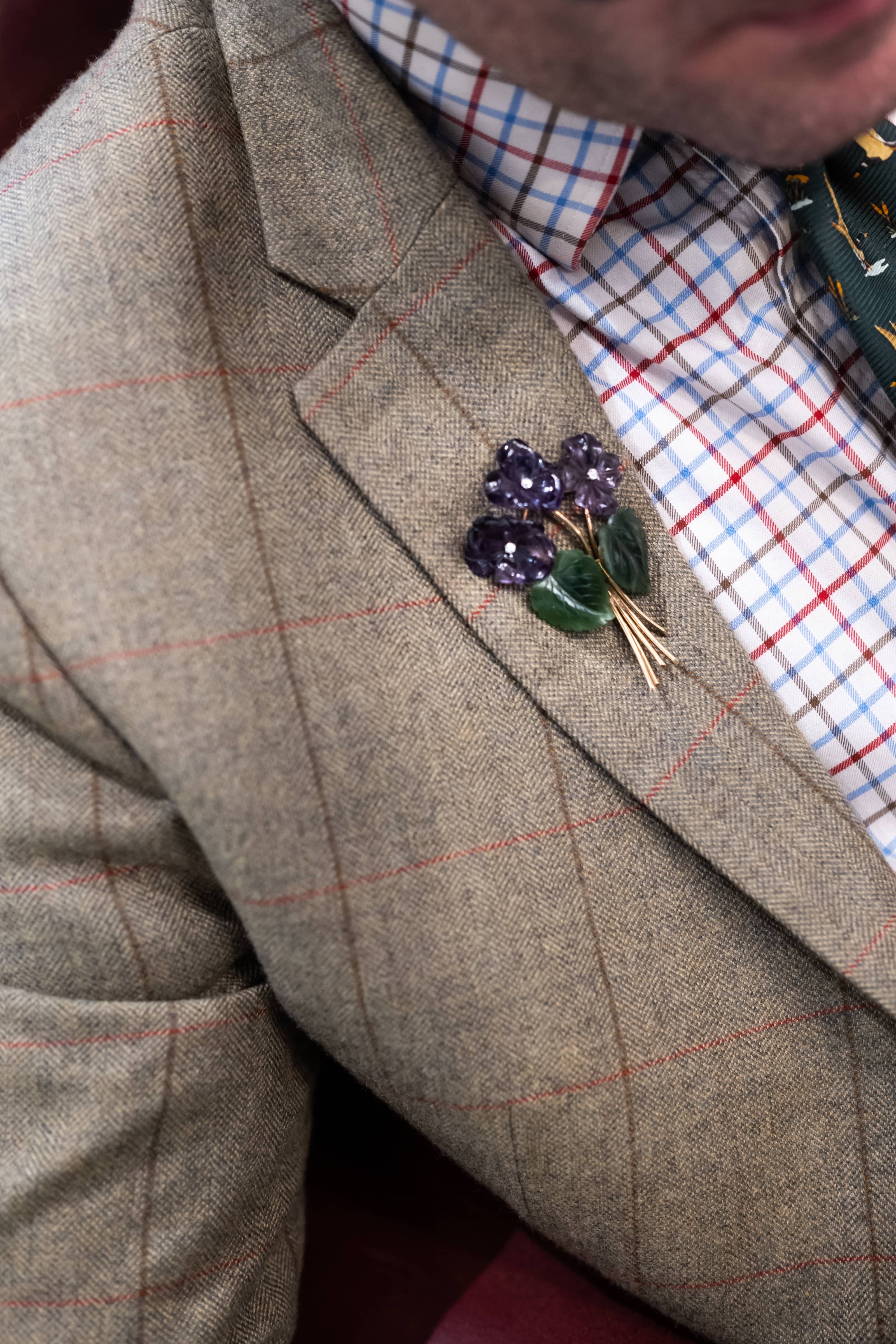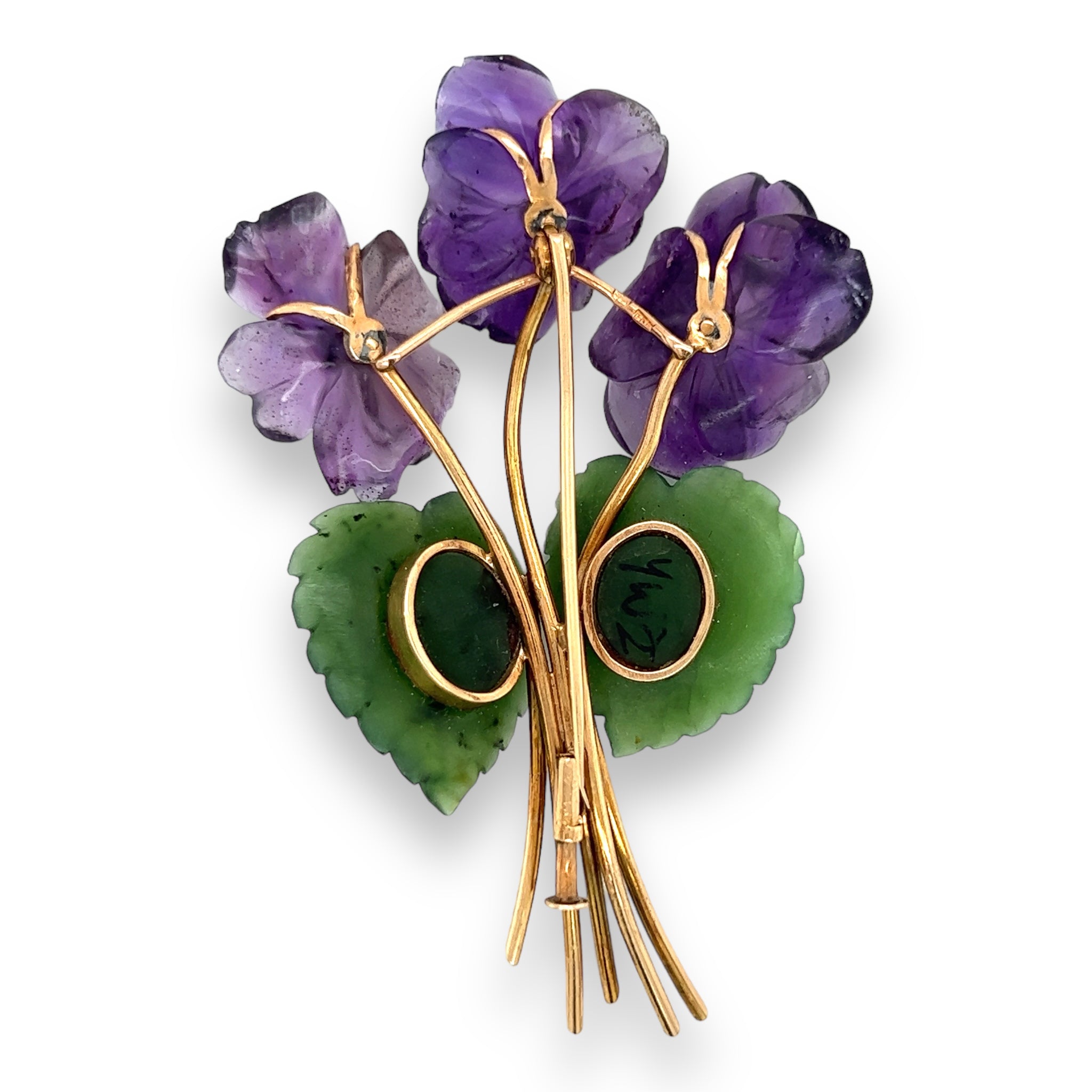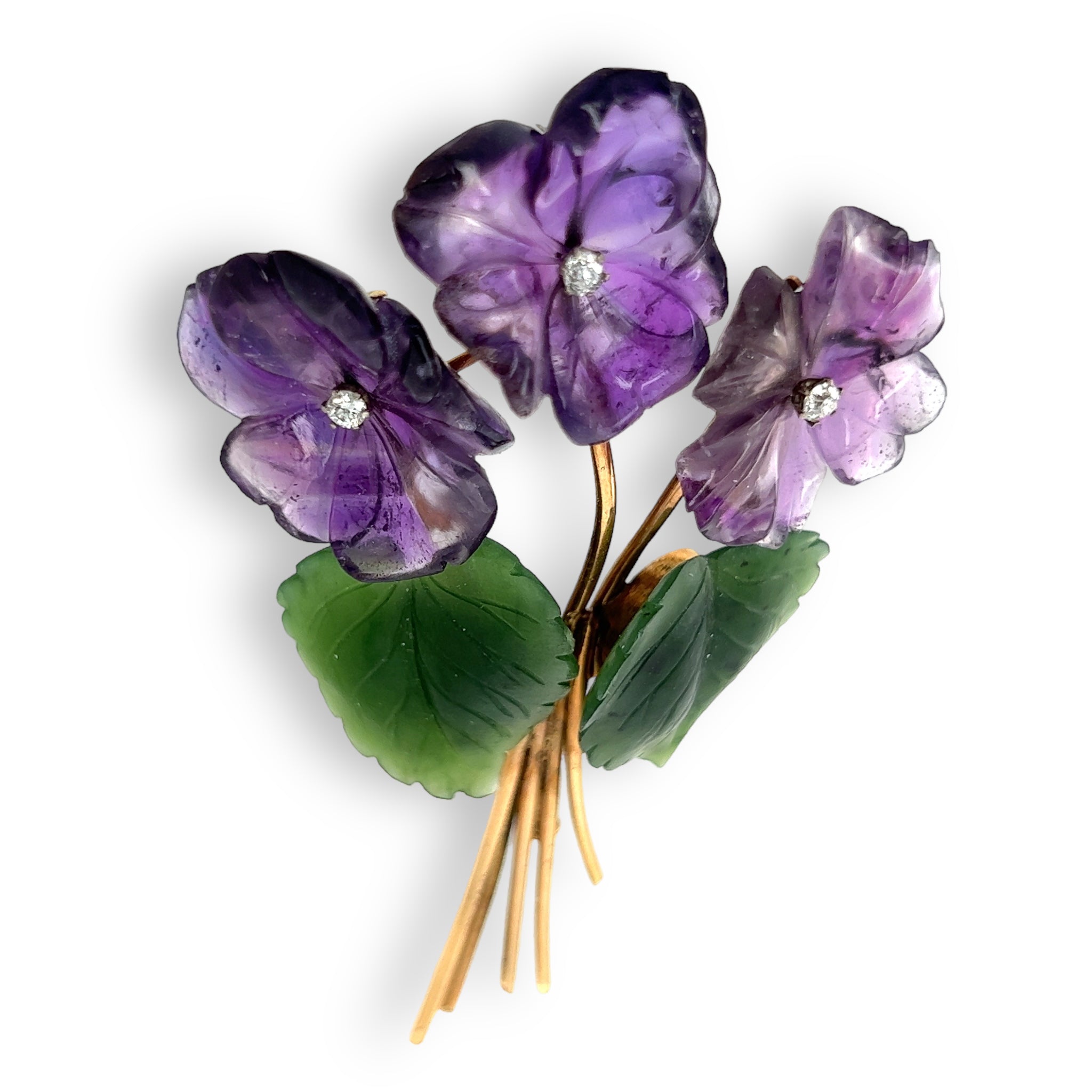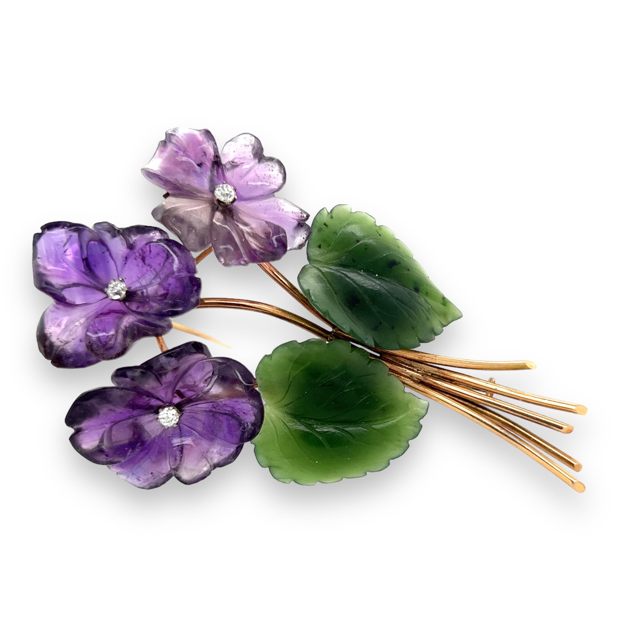 A beautiful amethyst, nephrite and diamond floral brooch. This typically Austrian jewelled brooch is bold in colour and accented with small diamond to the centre of the carved amethyst petals. The carved nephrite leaves are in exceptional condition and the gold wire stems sweep elegantly from behind the carving. Fitted with a brooch pin and safety catch.
