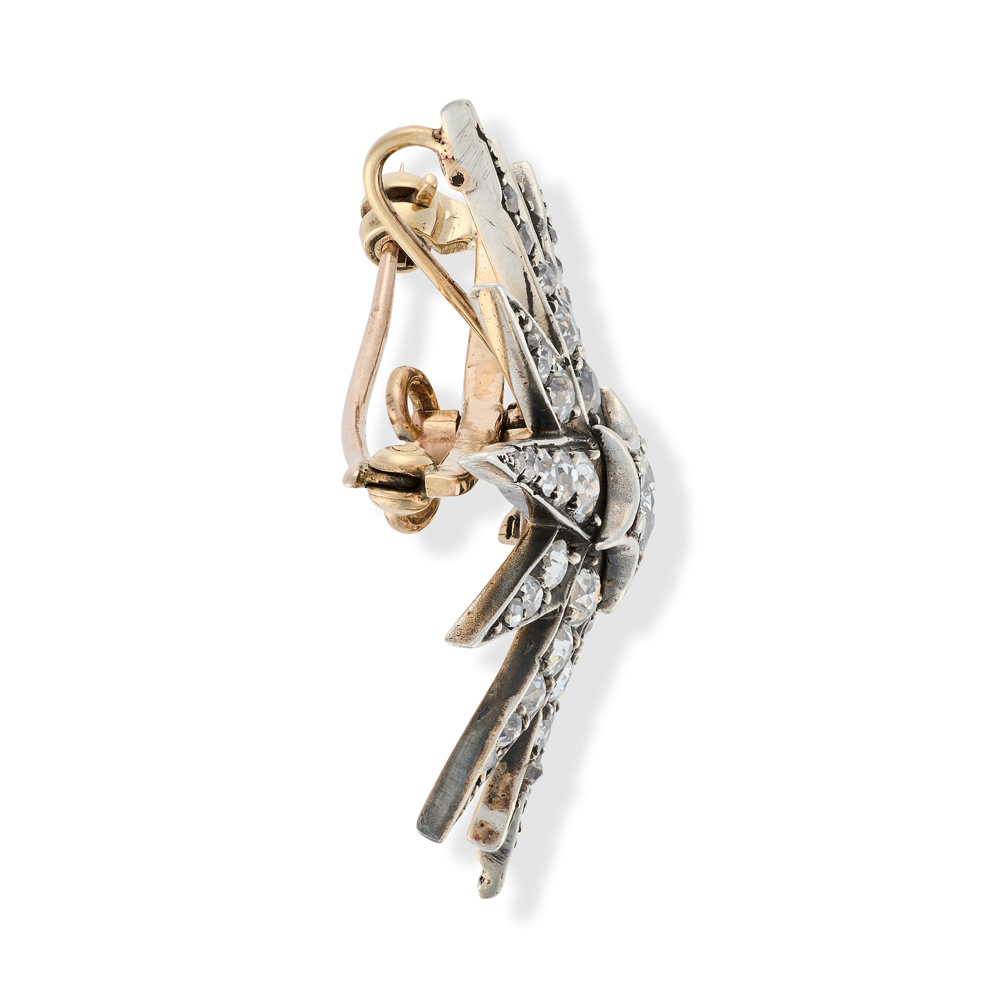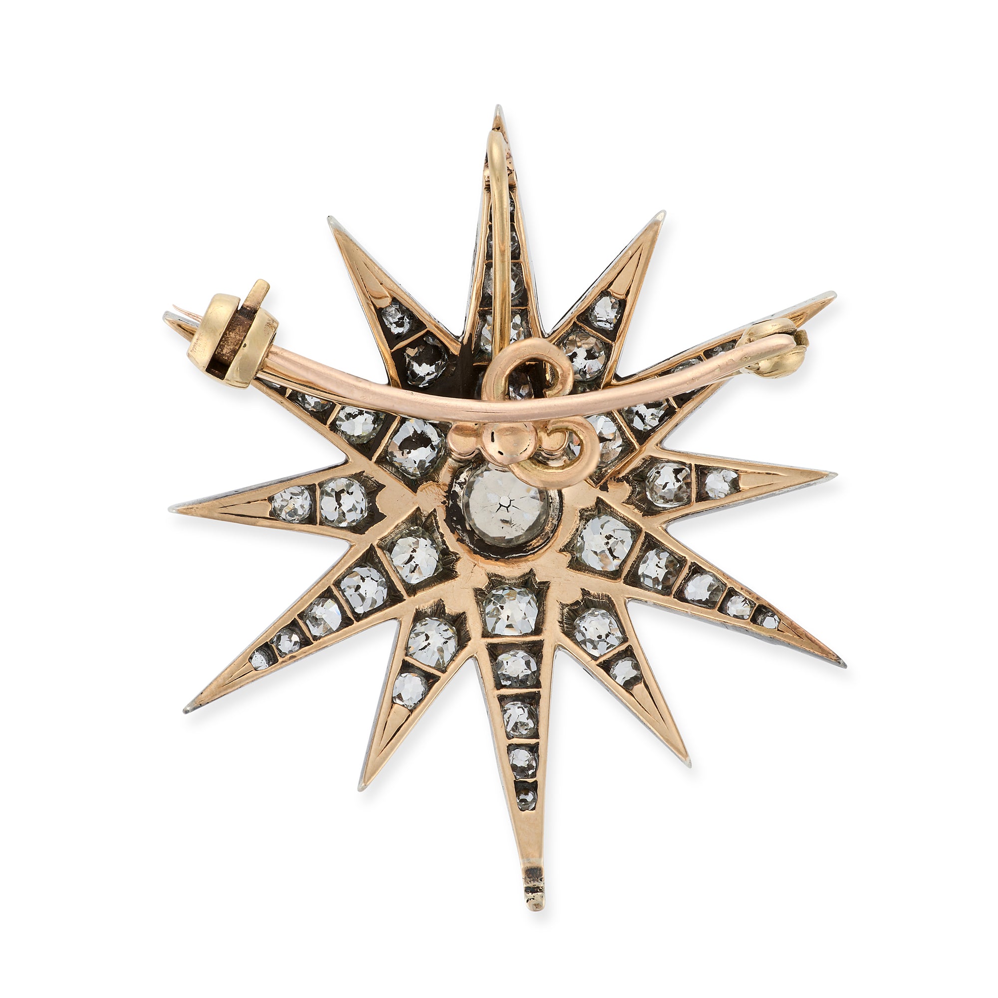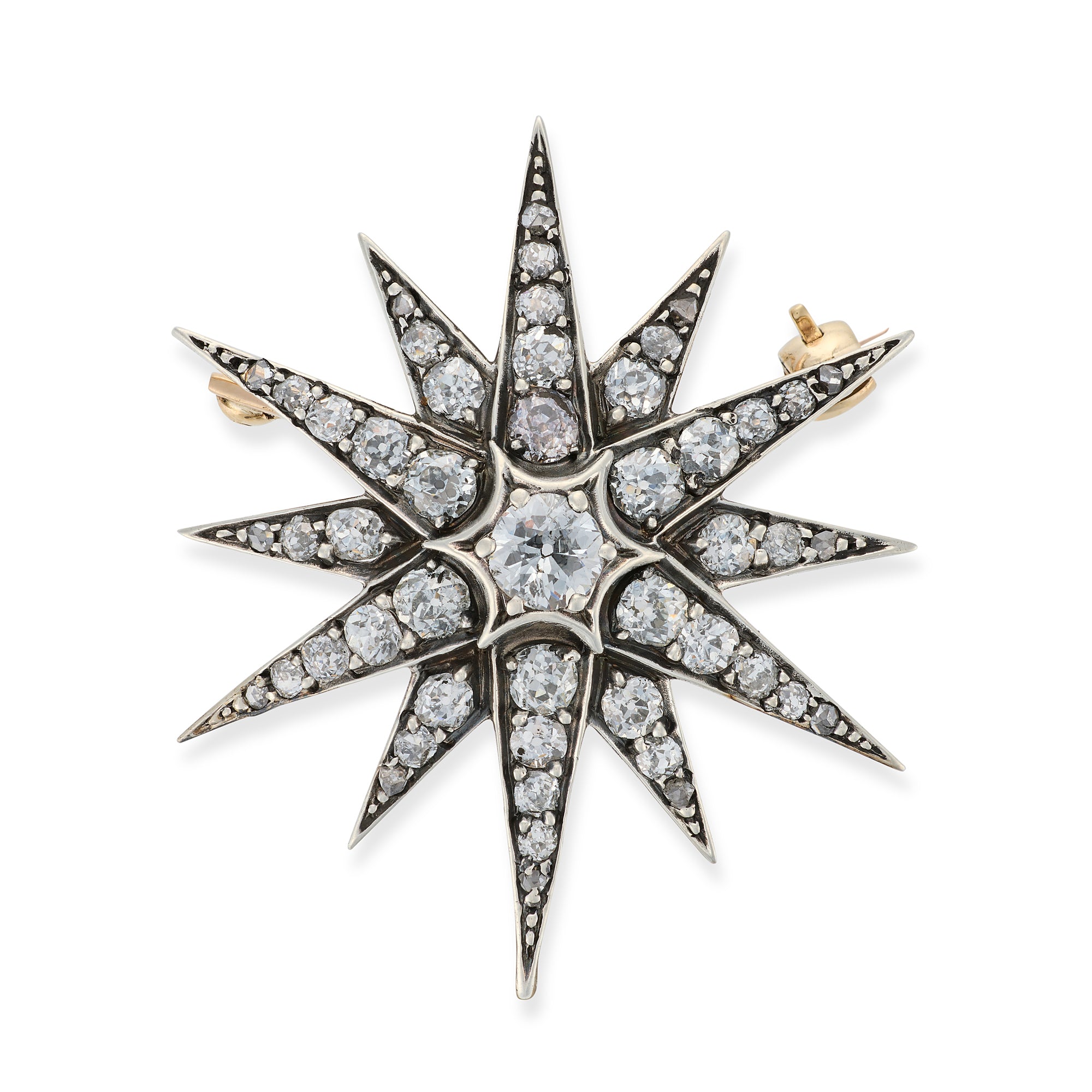 This exquisite diamond star brooch embodies the opulence of the Victorian era. Featuring a dazzling twelve pointed star embellished with approximately three carats of meticulously crafted old mine cut diamonds, set in a silver and gold frame. The versatile brooch fitting can be effortlessly removed, transforming this stunning piece into a captivating pendant.