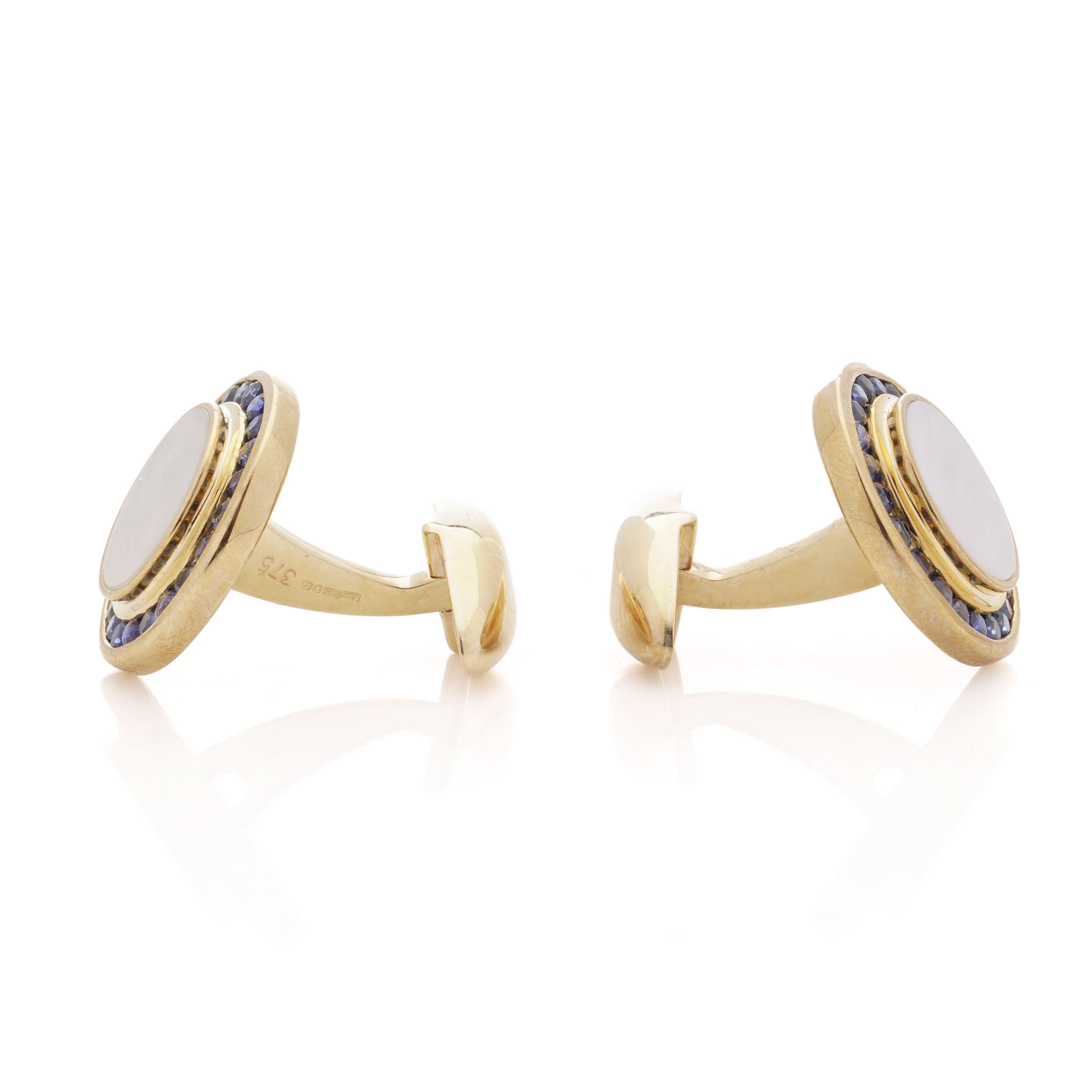 These exquisite cufflinks combine the brilliance of 9ct yellow gold with shimmering mother of pearl centres and a sparkling boarder of blue sapphires, making the perfect choice for an unforgettable evening. Captivating and timelessly stylish, these stunning cufflinks are guaranteed to make a statement.