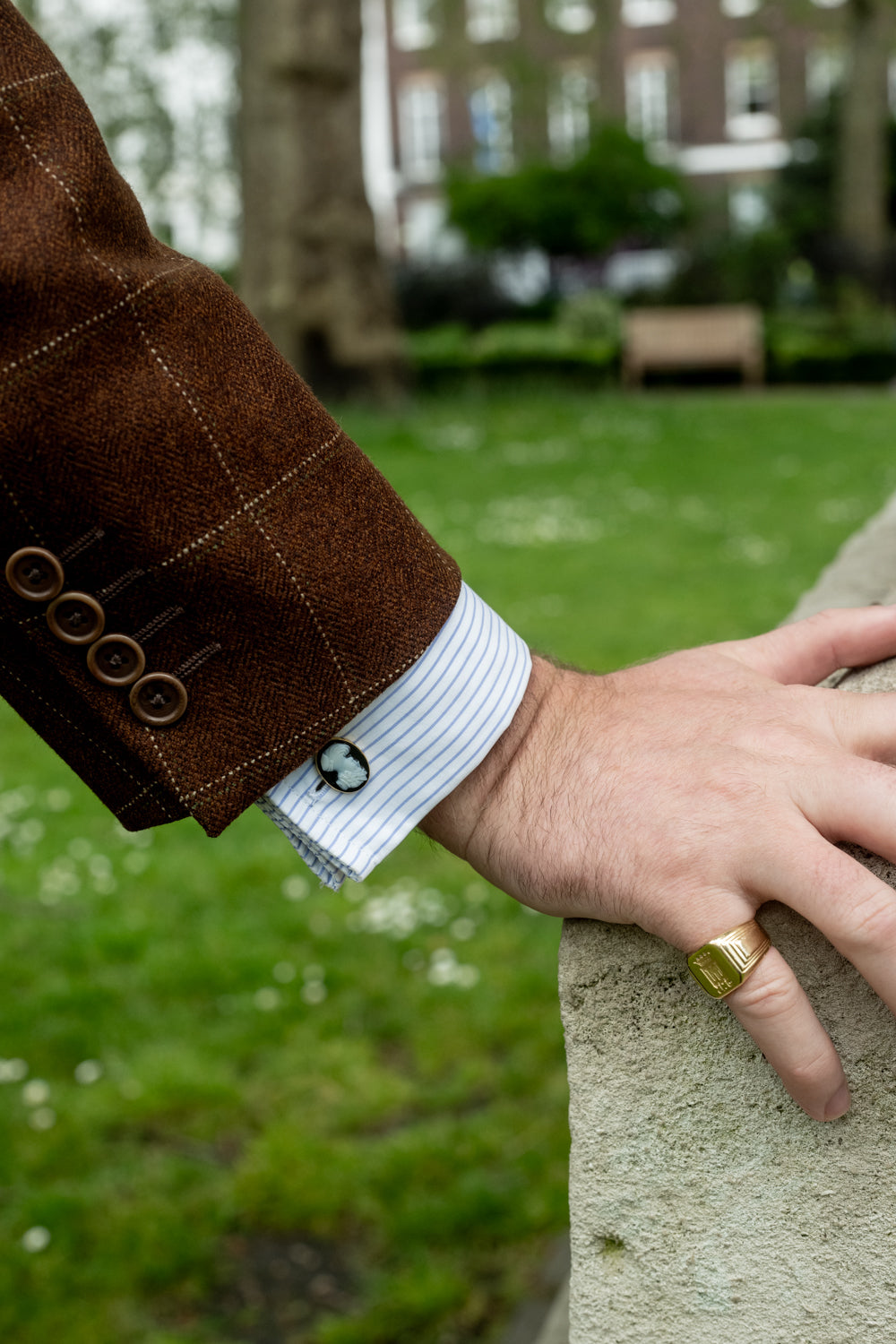 A fine pair of cameo cufflinks, Victorian. The cufflinks are formed of four panels on chain link fittings. The hand carved cameos depict a knight and maiden.