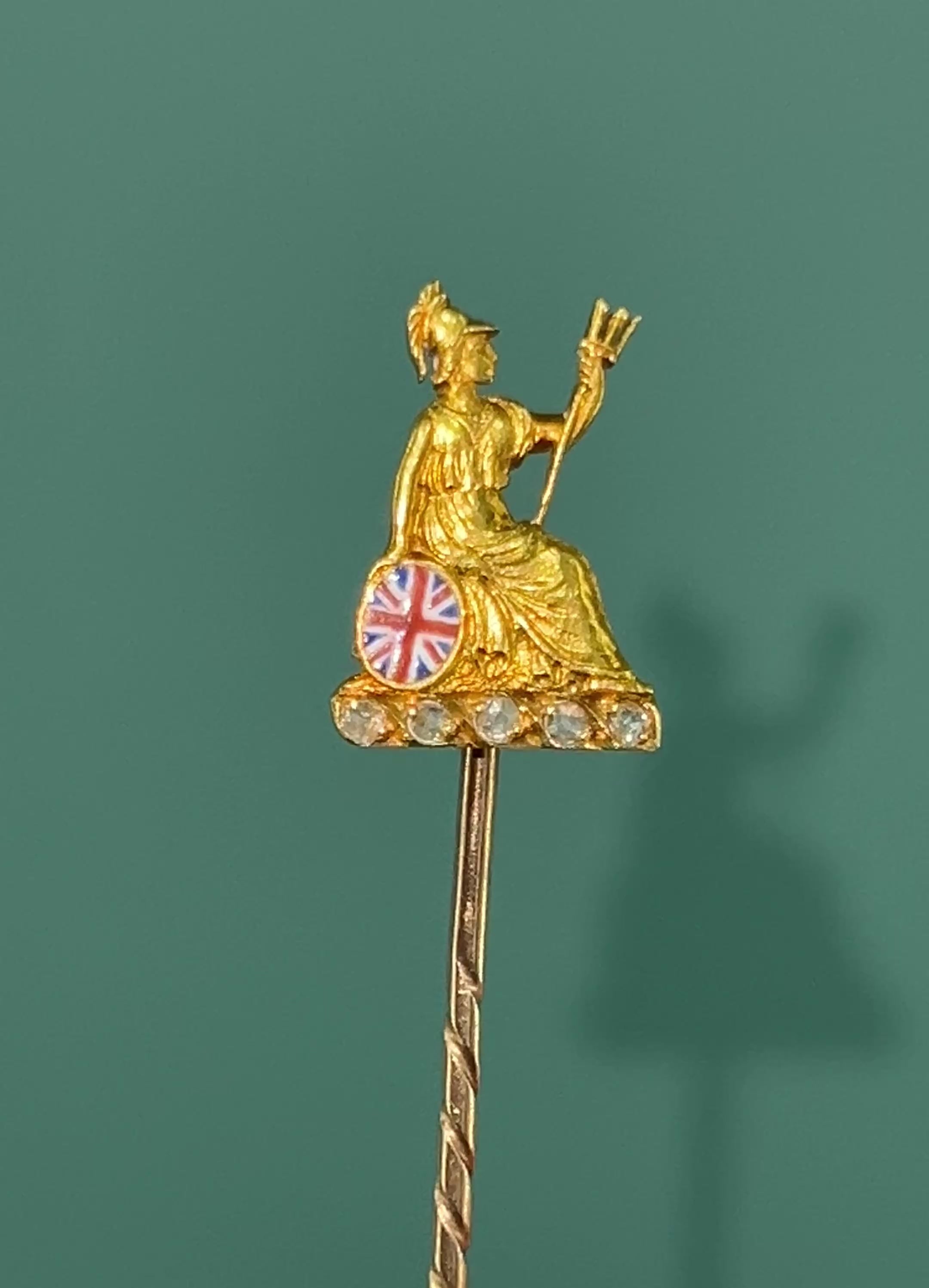 The Victorian Diamond & Enamel stickpin of Britannia will take your breath away with its 18ct yellow gold craftsmanship, five rose cut diamonds and the iconic union flag detailed with enamel. Make a statement and show your true colours with this luxurious and sophisticated gem. Let it adorn your most special occasions and be the envy of your peers!