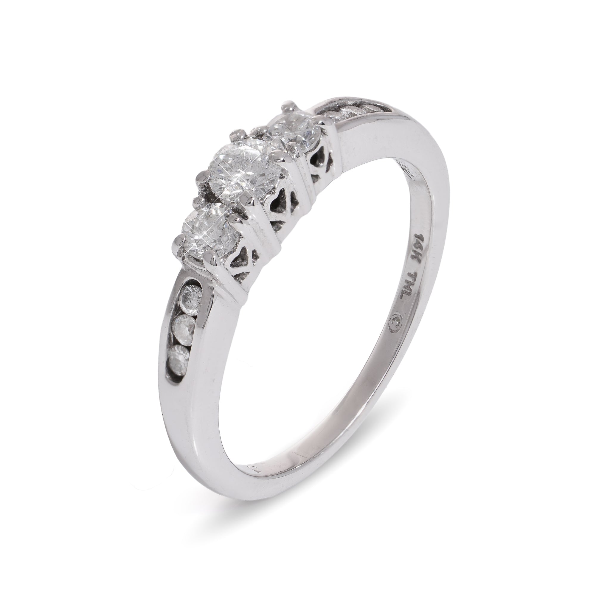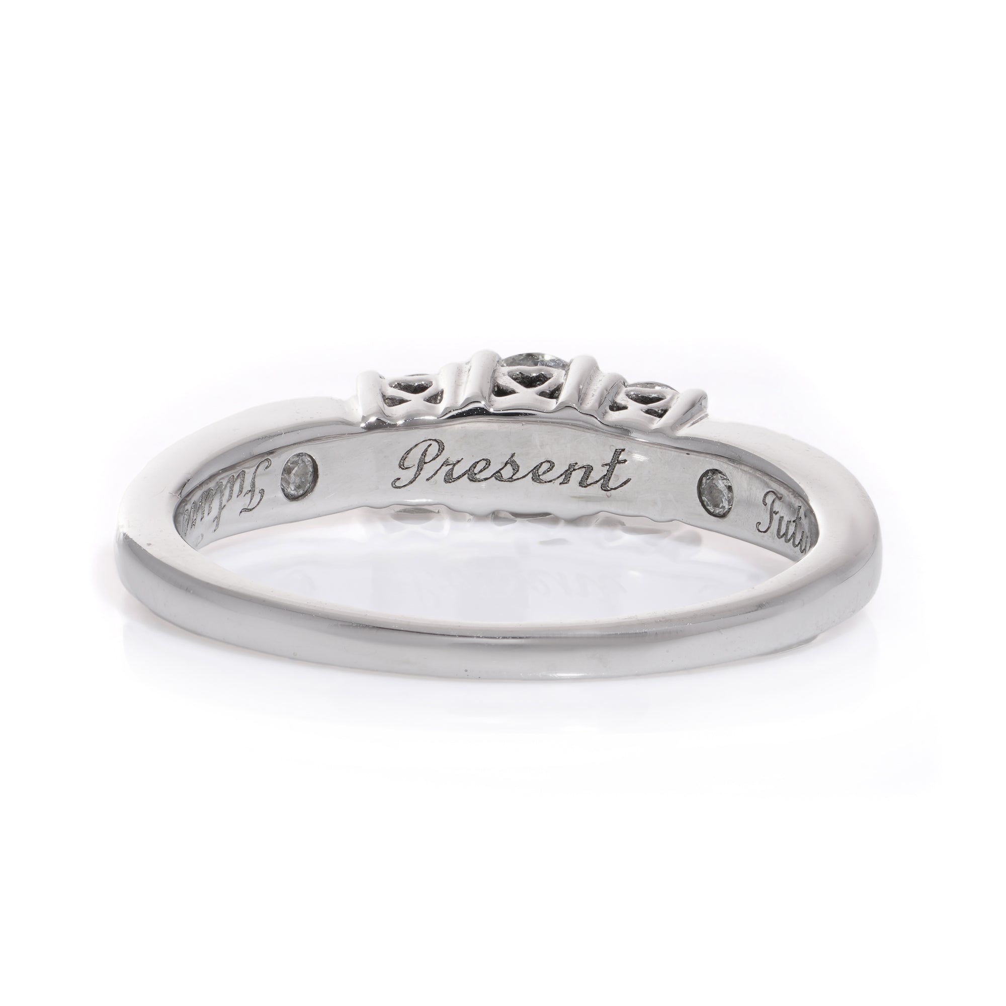 This exquisite 14ct white gold diamond three stone ring offers an opulent way to symbolize true love. Featuring three brilliant cut diamonds at the focal point, bespoke diamond set shoulders, and two dainty diamonds set to the underside of the head, the ring is cleverly engraved to the underside with sentiments of 'past, present, and future.' A luxurious and timeless statement of affection.