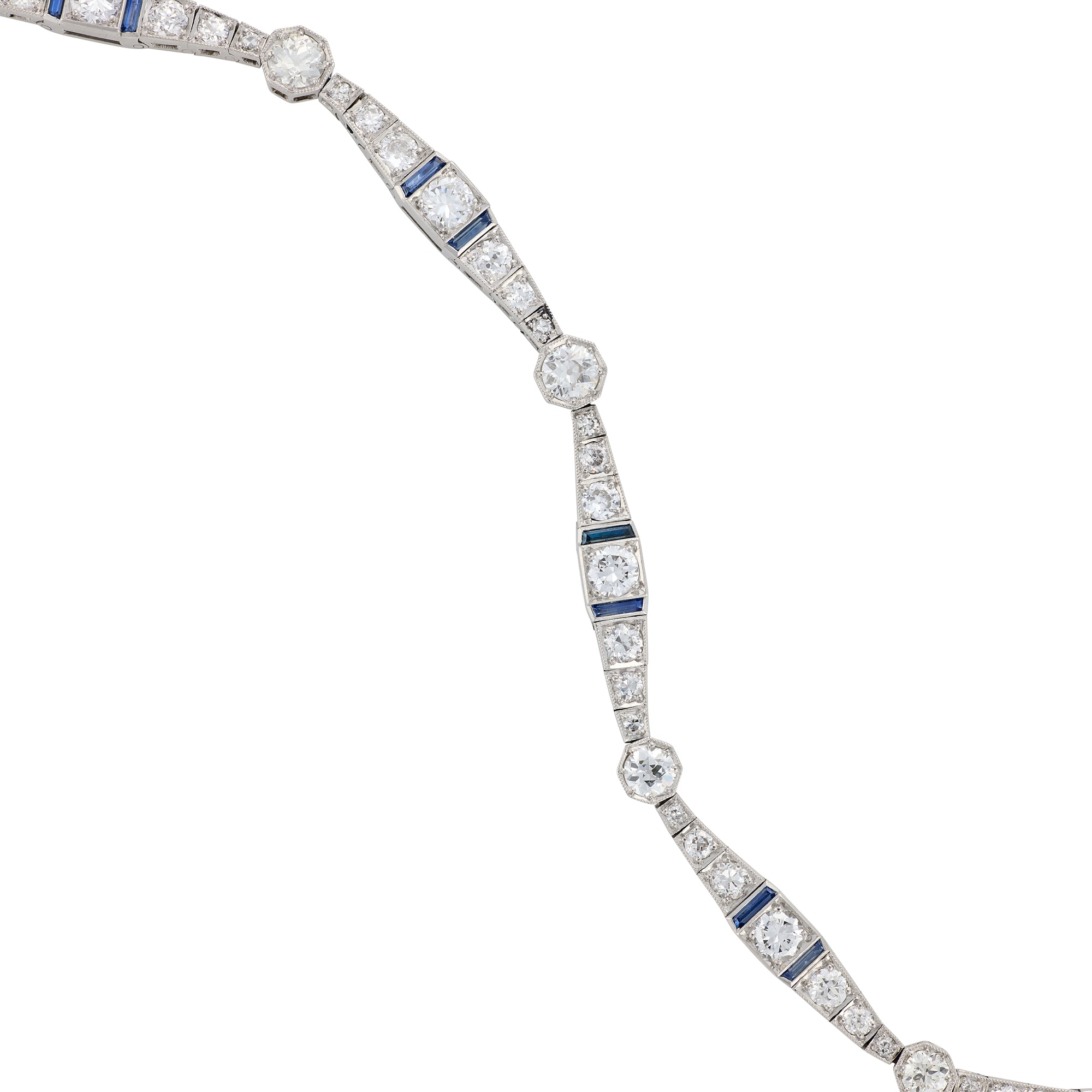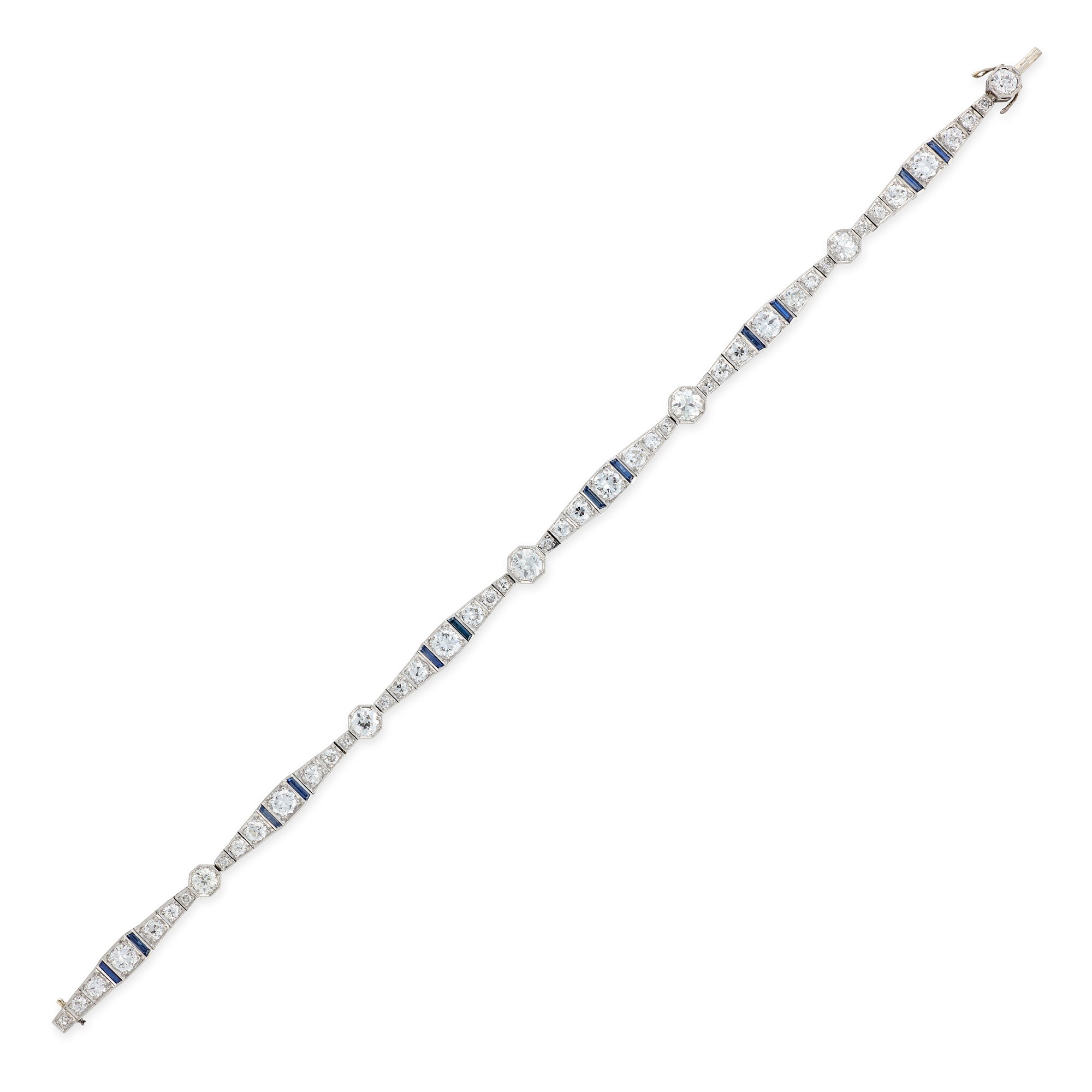 A very fine sapphire and diamond bracelet from the height of the Art Deco period, 1920. Made in platinum and designed as six articulated sapphire and diamond set sections. Each section is principally set with an old cut diamond in a boxed claw setting and flanked by two trapezium cut sapphires. To either side of the central diamond are three further old cut diamonds graduating in size. Each section is interspersed with an old cut diamond in an octagonal shaped setting with milgrain detailing. This is a very fine bracelet and has survived in excellent condition.