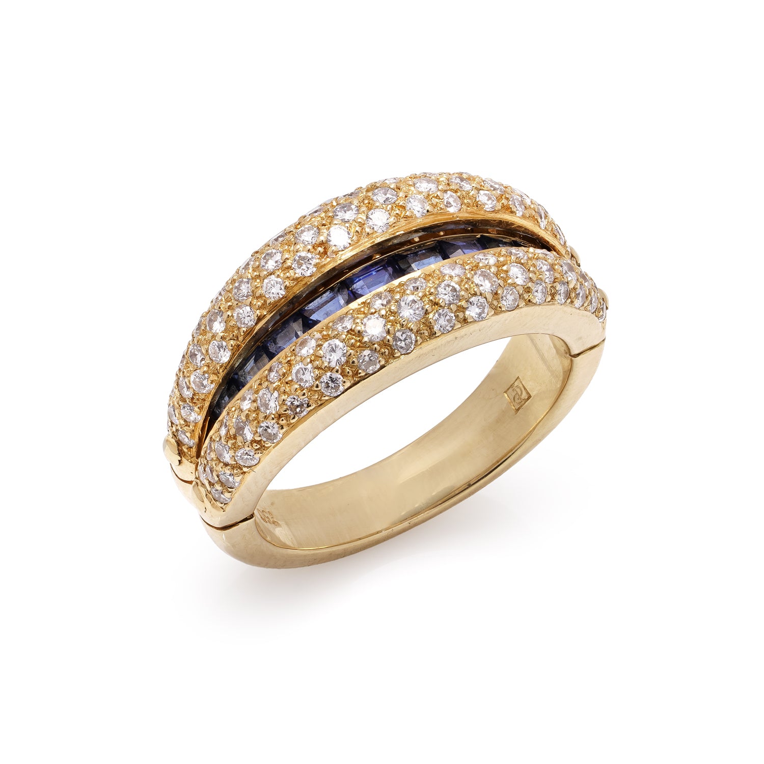 Wildsmith Jewellery are excited to offer this wonderful ring for sale. Referred to as a "Night & Day" Ring! This 18ct yellow gold ring features two diamond set terminals and a secret hinge mechanism that reveals a row of calibre cut sapphires, making it perfect for both day and night.