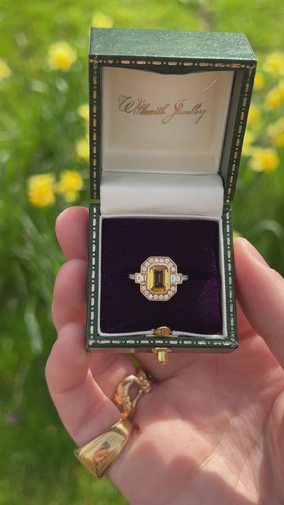 This exquisite Art Deco style ring showcases a magnificent emerald-cut golden sapphire as its focal point, secured in a refined rub-over setting. Radiant brilliant-cut and elegant baguette-cut diamonds frame the centre stone, while the band features meticulously matched brilliant-cut diamonds along the shoulders that create a seamless flow. Crafted in lustrous 18ct yellow gold, this piece exemplifies timeless elegance and exceptional craftsmanship.