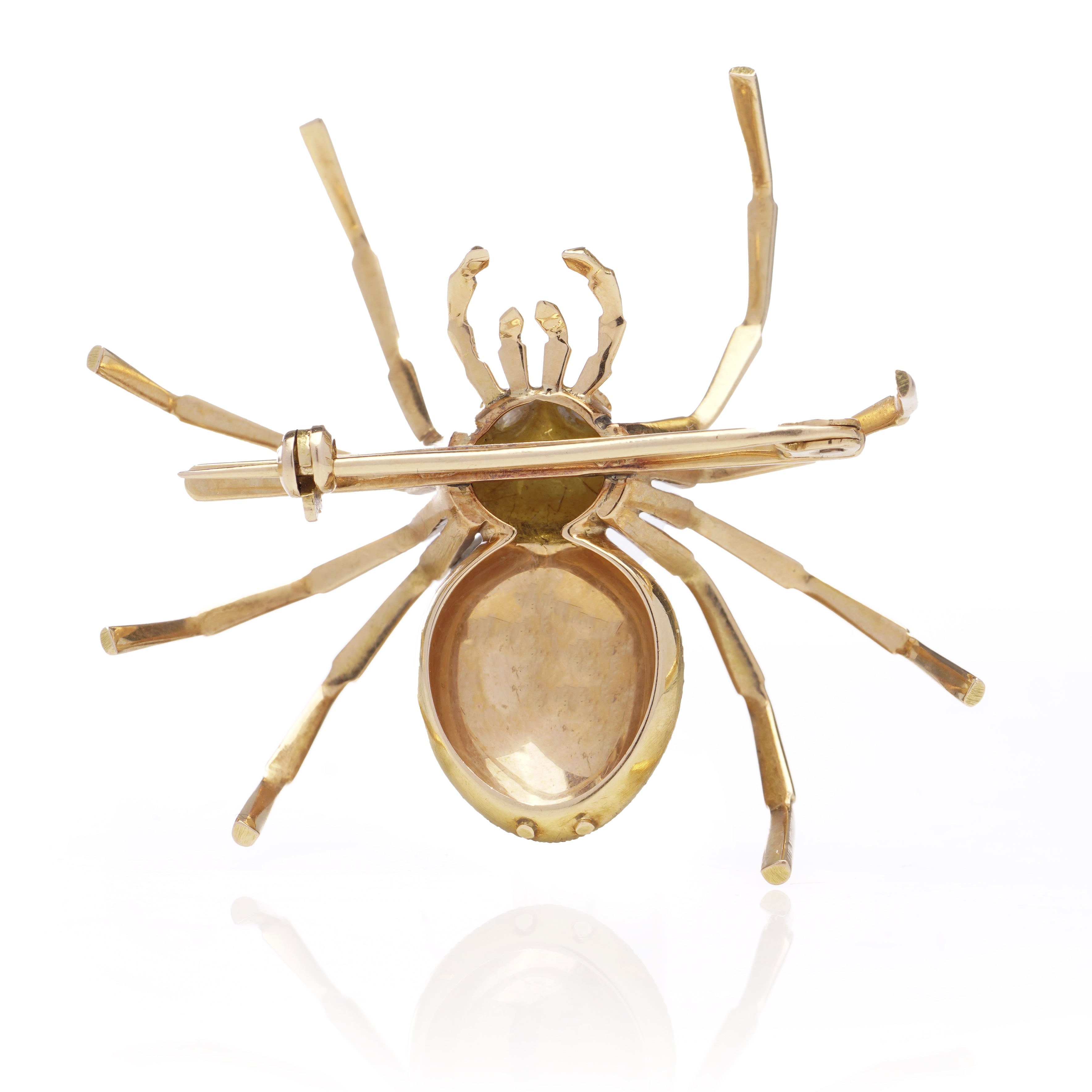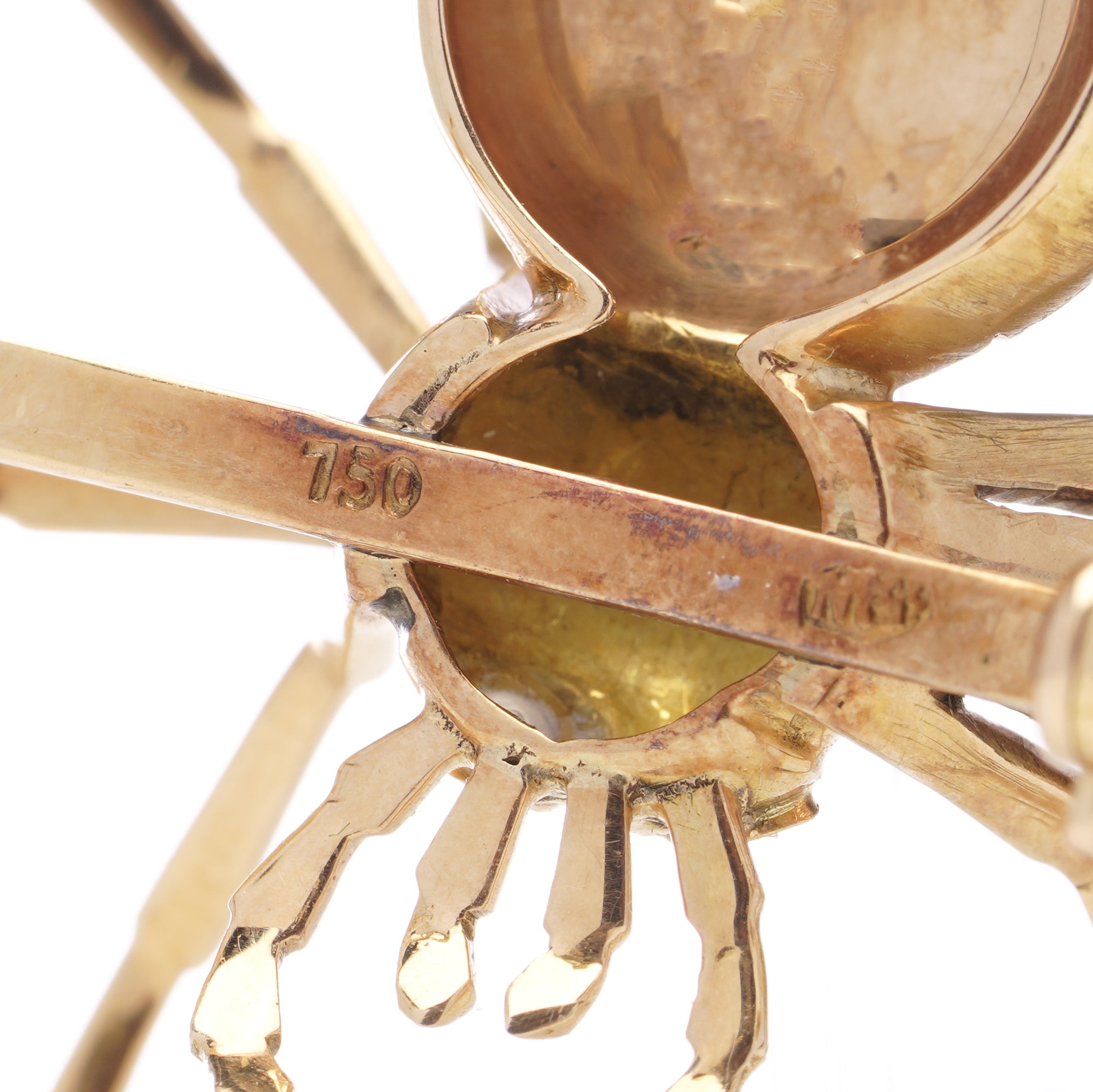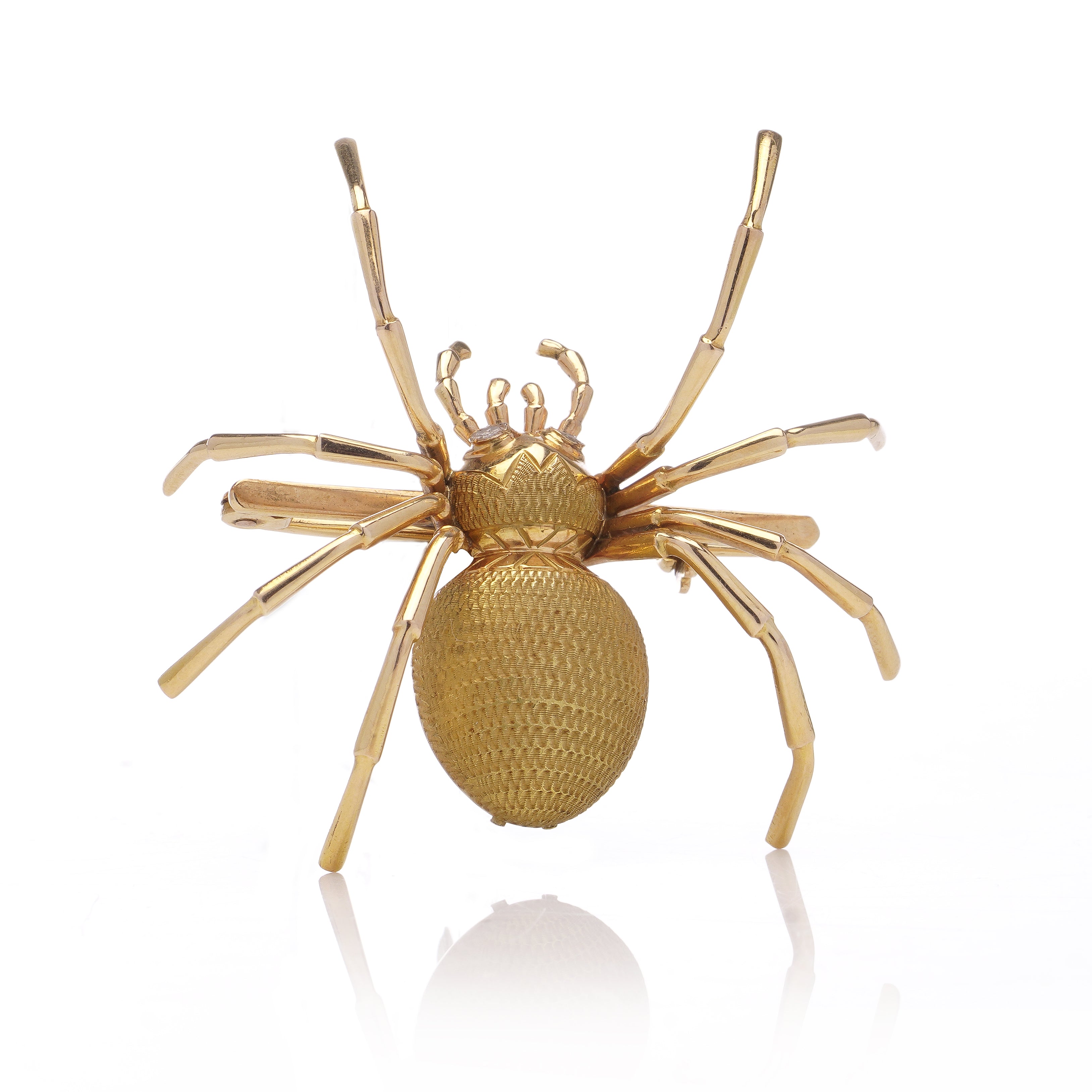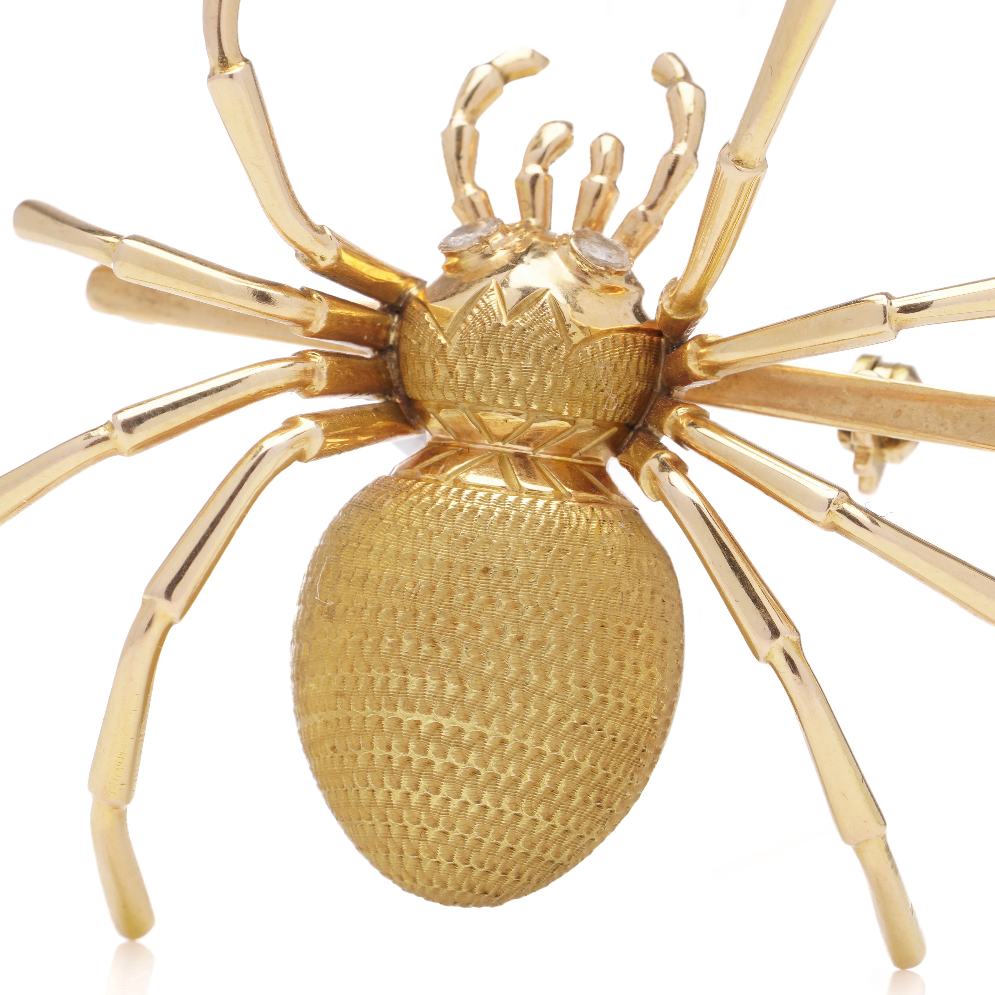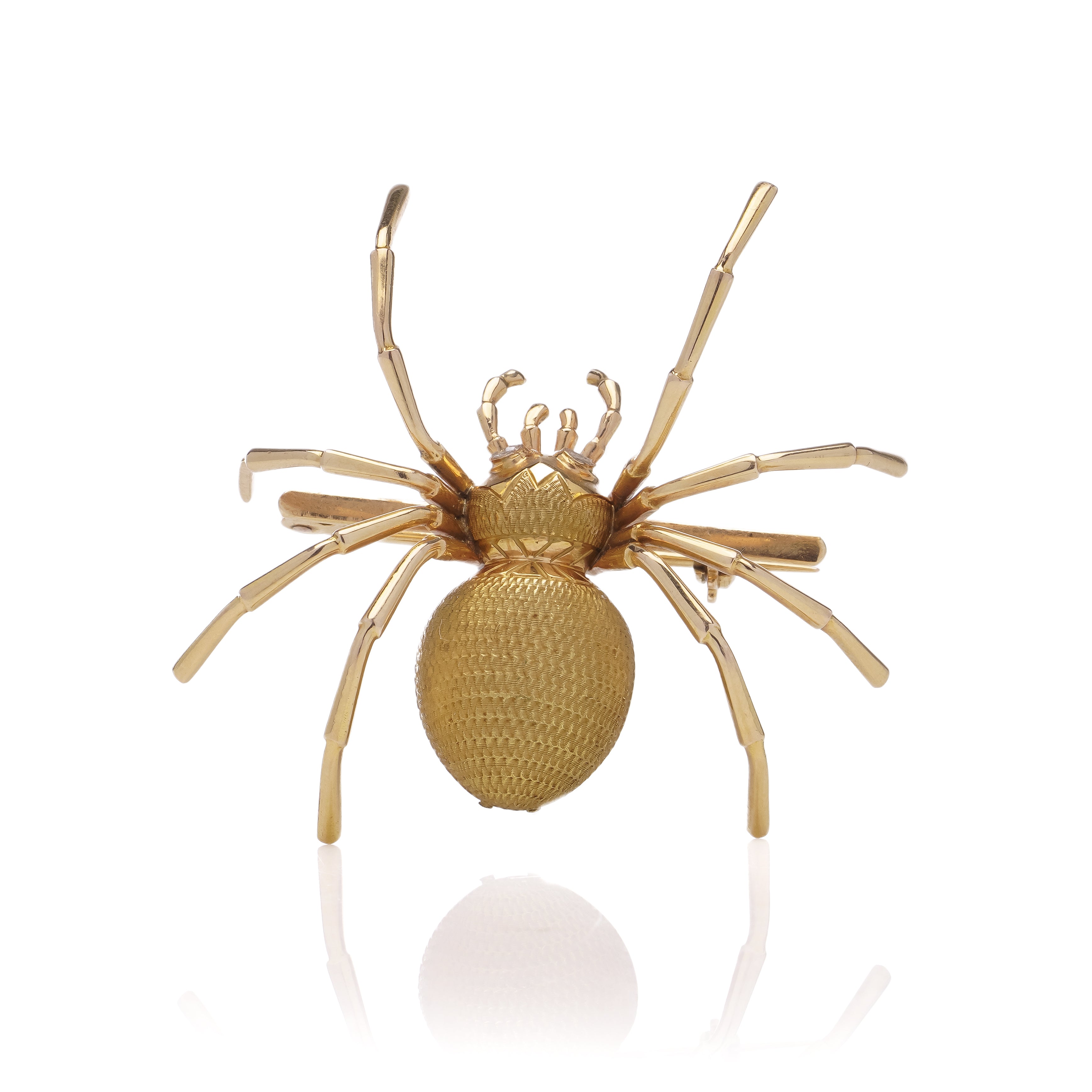 Arachnophobes look away now! This amazing brooch in the form of a spider is sure not to go unnoticed. The body and head of the spider is designed with a satin finish and scalloped gold detailing, with diamond eye detail. The spiders legs are detailed with joints and a polished finish. With a brooch pin and roller catch clasp.