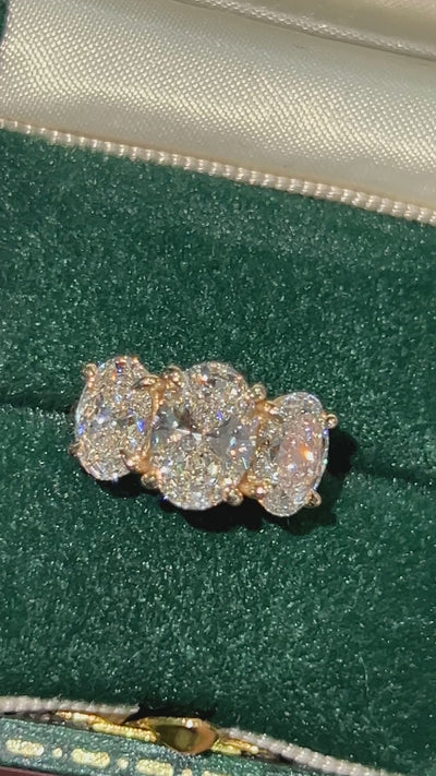 A beautiful diamond engagement ring by Wildsmith Jewellery. Set with three oval cut diamonds to an 18ct gold handmade mount. The 2.1mm band tapers up to knife edge shoulders. This ring can be customised to suit your bespoke requirements, a choice of natural or lab grown diamonds are available.