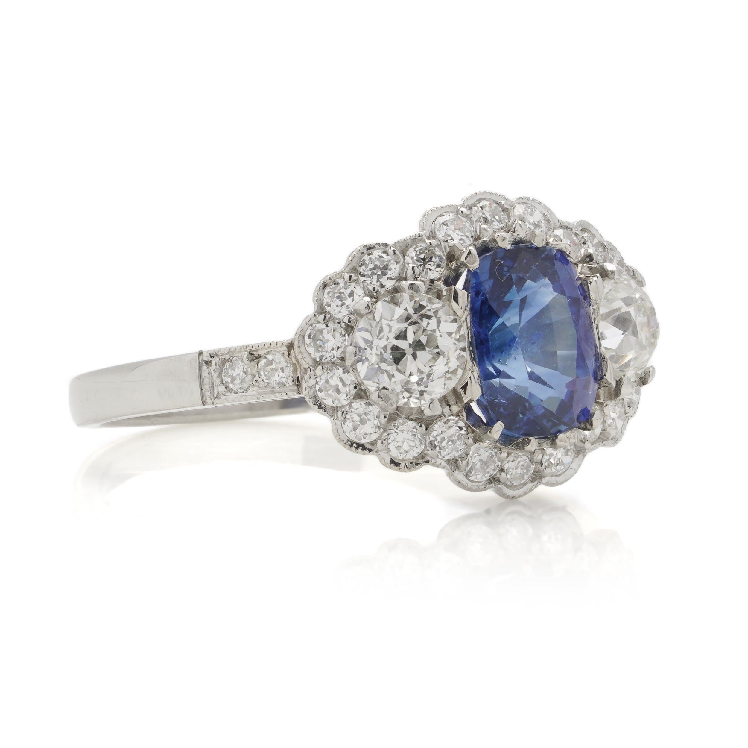 It cradles an oval-cut blue sapphire at its heart, secured in an elegant claw setting. On either side of this resplendent sapphire, two round, old-cut diamonds also find their place within the delicate embrace of claw settings.