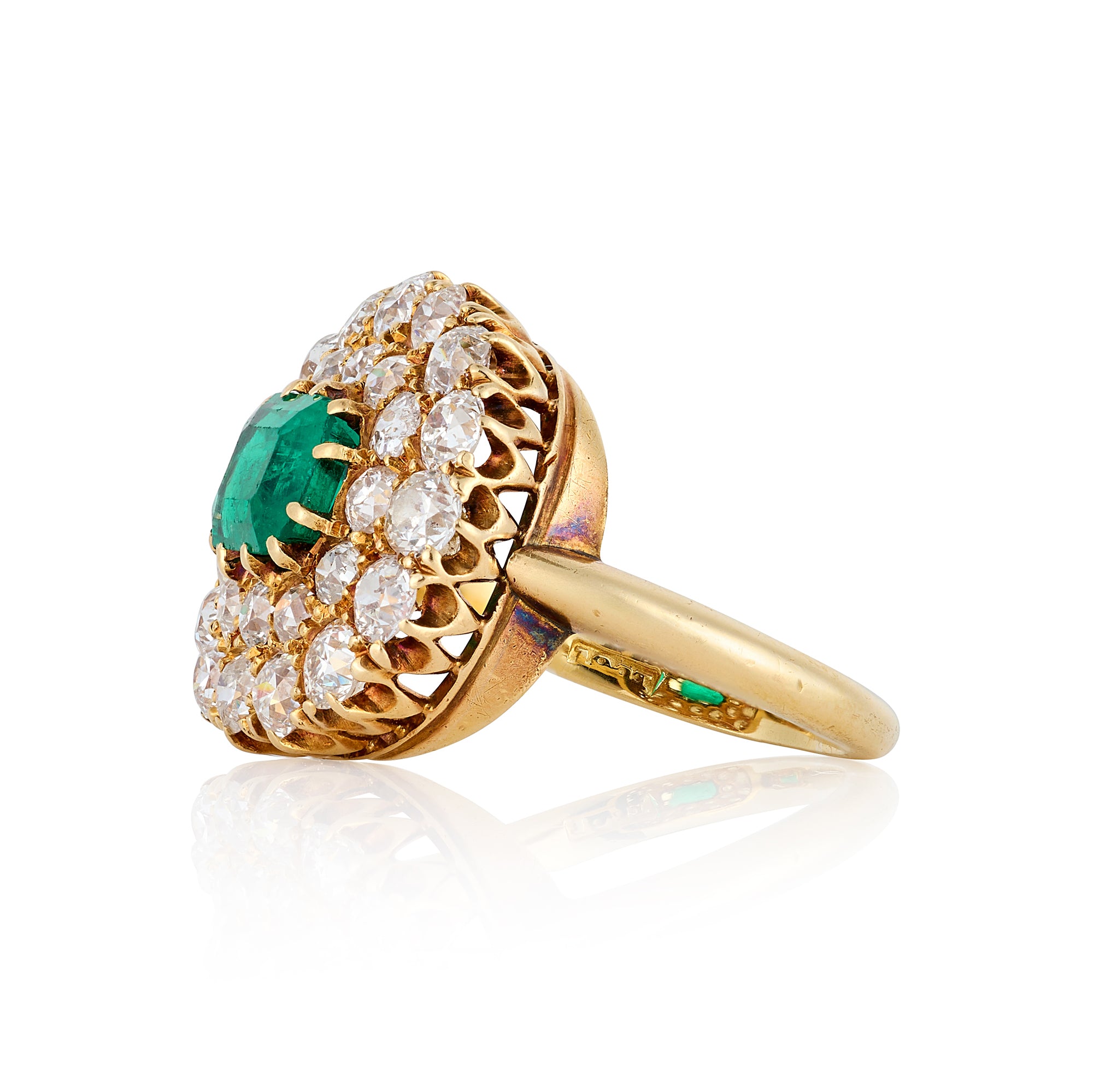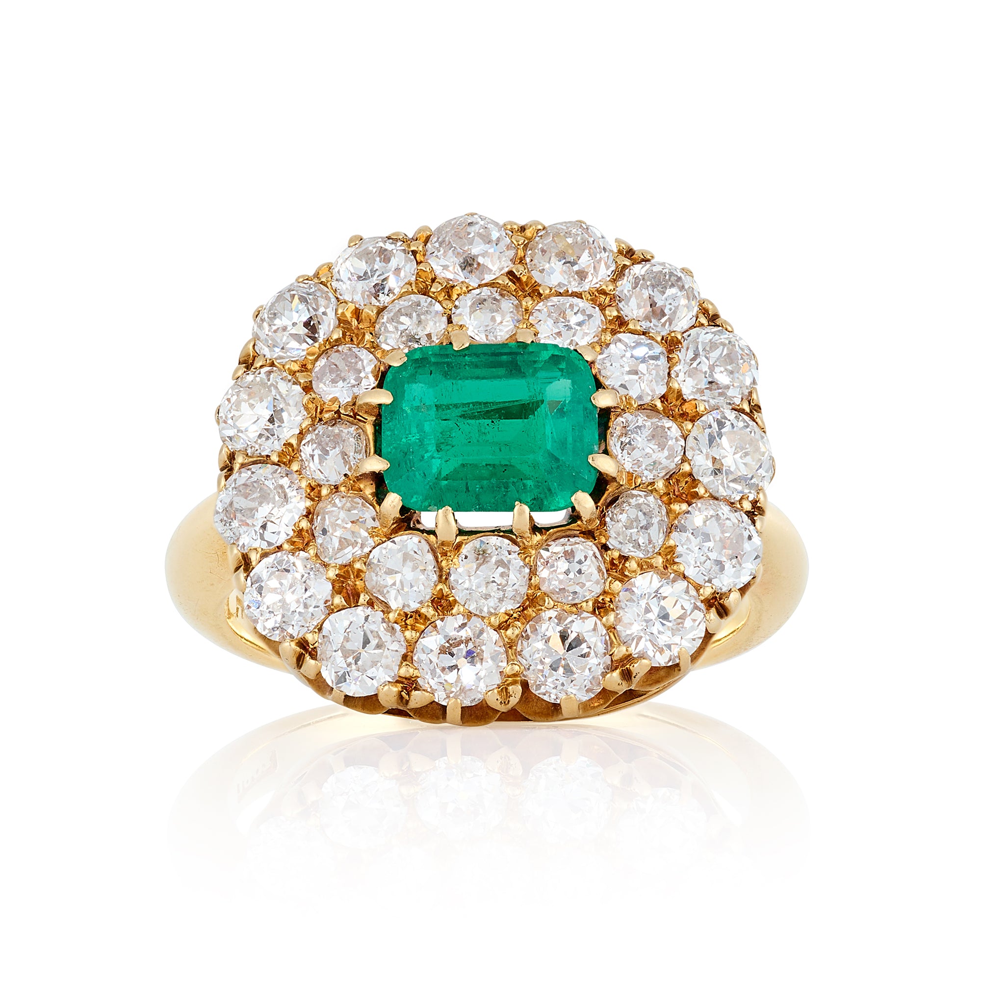 A wonderful antique emerald and diamond cluster ring. Centrally set with an emerald cut colombian emerald the ring is further embellished with two rows of crispy old cut diamonds forming the outer detail. Set fully in 18ct yellow gold.