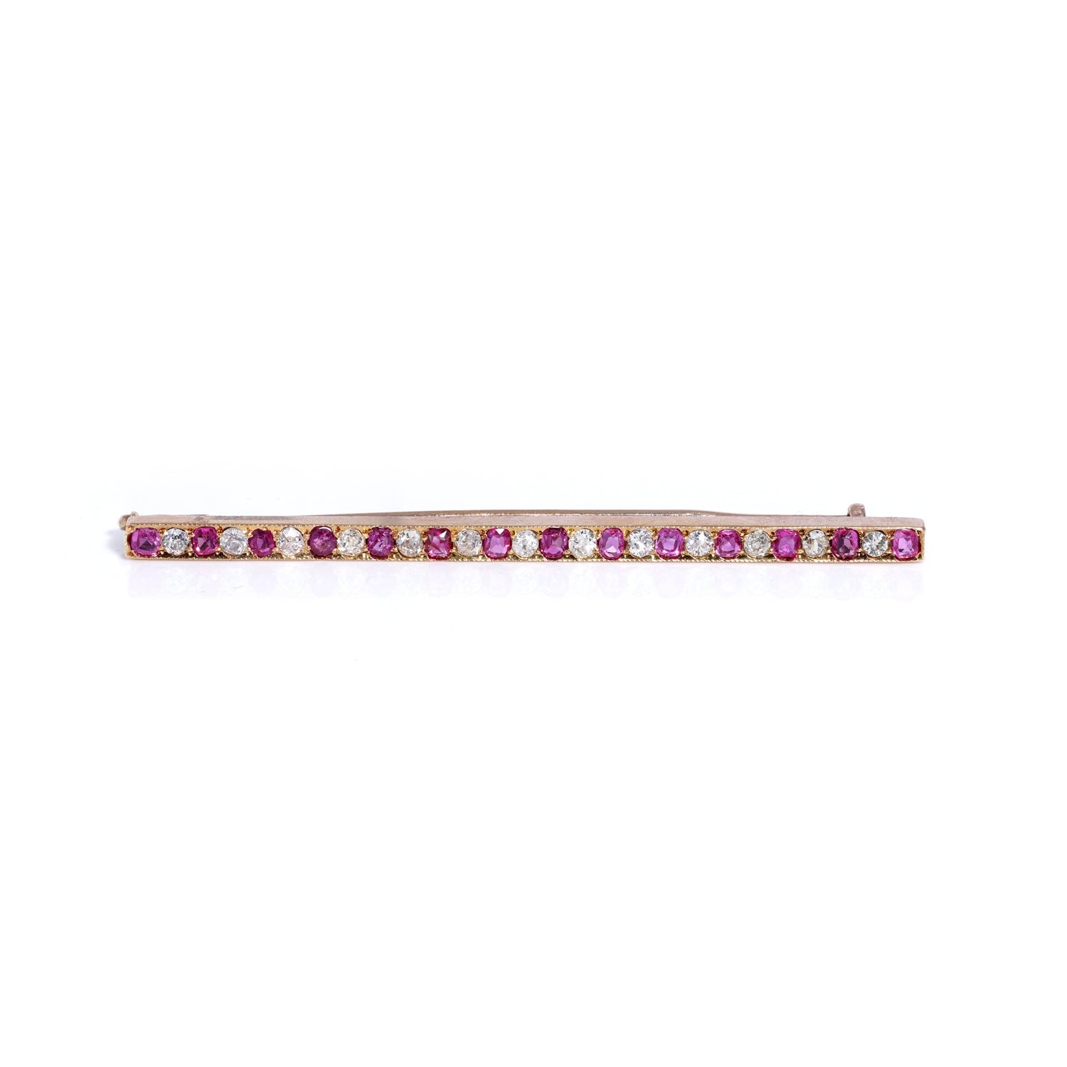 An antique ruby and diamond bar brooch. Set with thirteen old mine cut diamonds and fourteen rubies in an alternating formation. Uniform in size, the gemstones are claw set to a 15ct gold boxed bar brooch setting. With a pn and safety cath, this is the perfect flourish for your lapel or scarf!