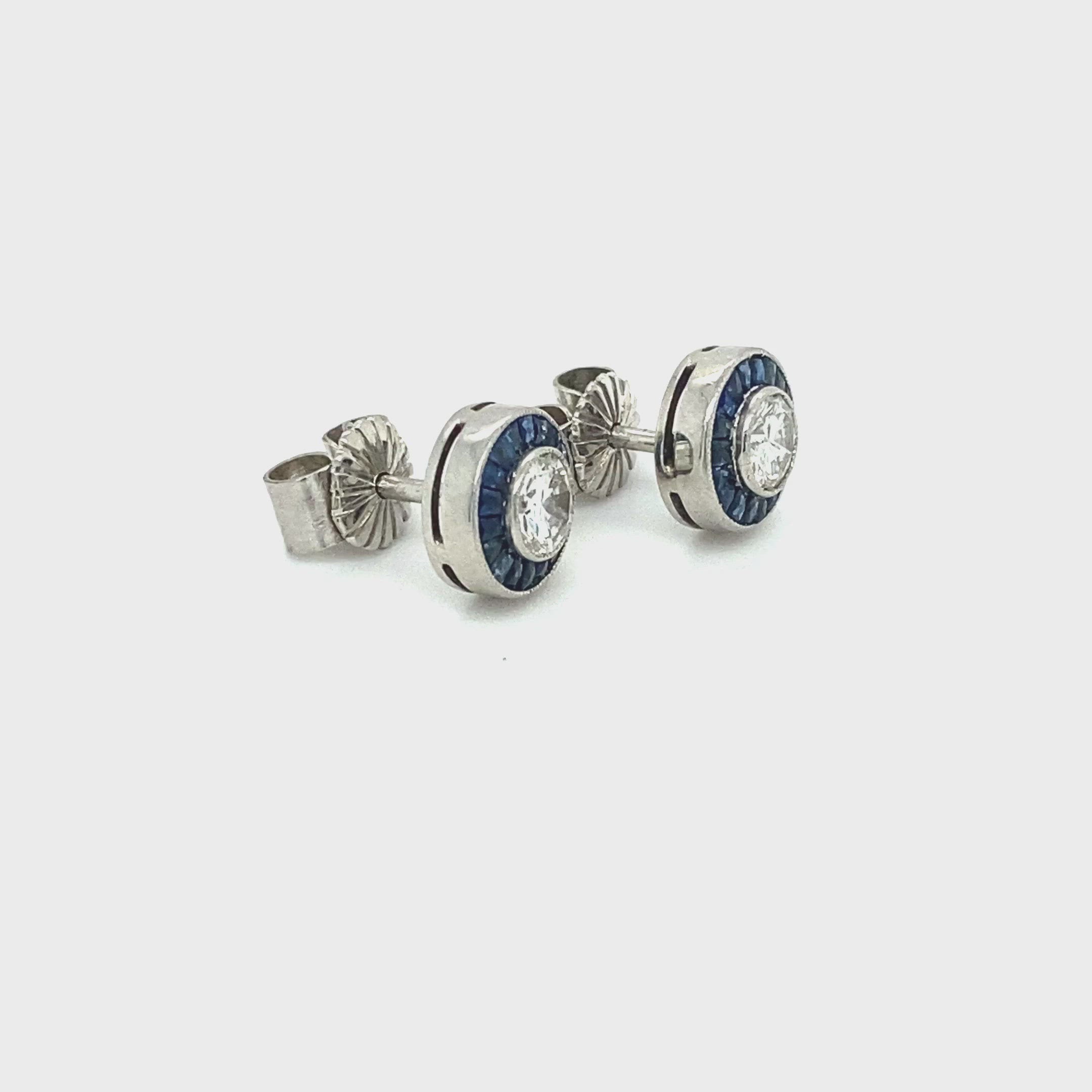 A pair of ArtDeco style sapphire and diamond target earrings. Each earring is formed of a 0.25ct round brilliant cut diamond rub over set to the centre with a row of calibre cut sapphires forming outer detail. The earrings are made in 18ct white gold with post and scroll fittings