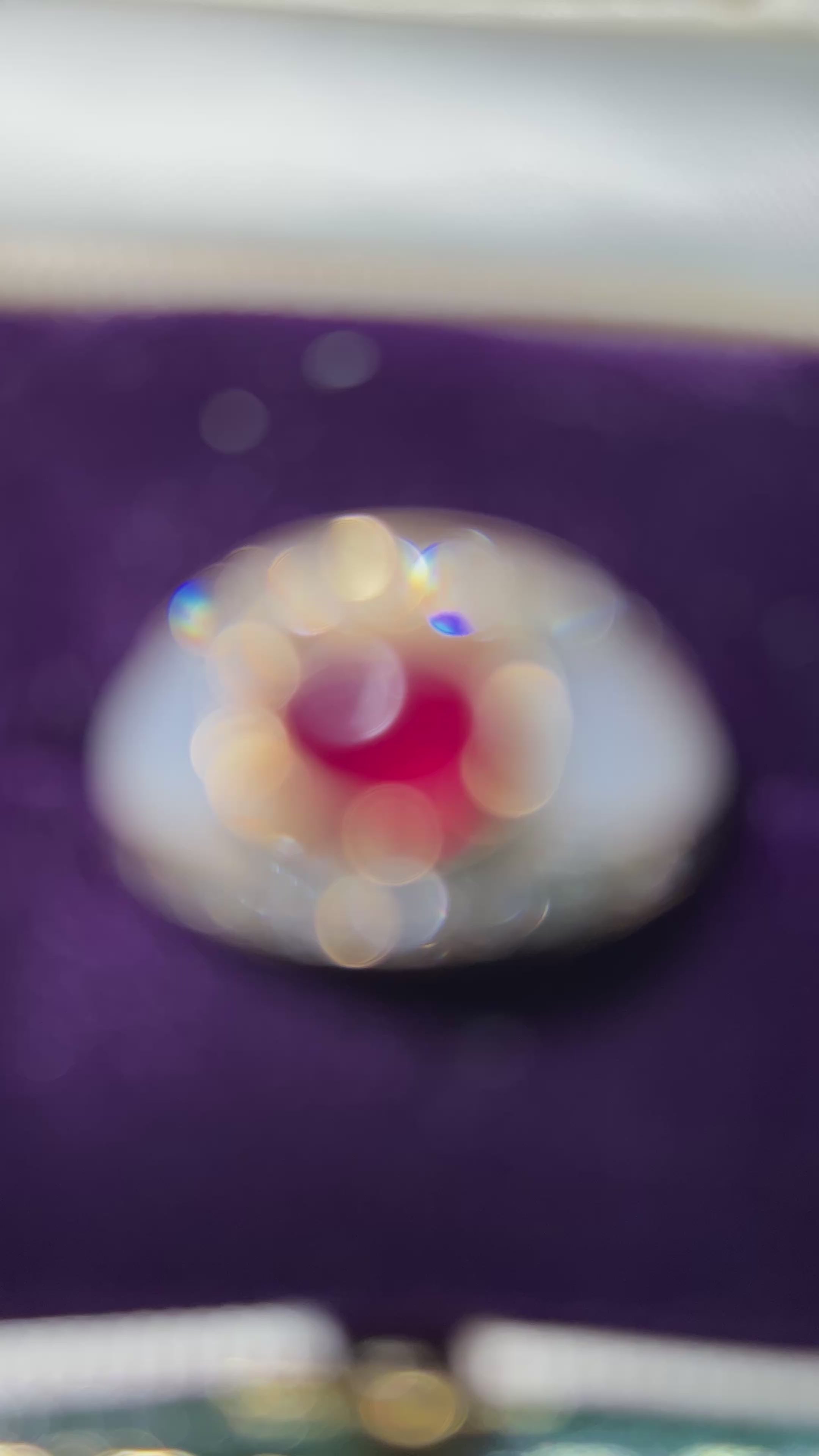Indulge in luxury with our Ruby, Diamond & Mother of Pearl Ring. The elegant central cabochon ruby, outer row of carre cut diamonds, and two panels of inlayed mother of pearl are set in 18ct yellow gold, creating a sophisticated and exclusive piece that will elevate any outfit.