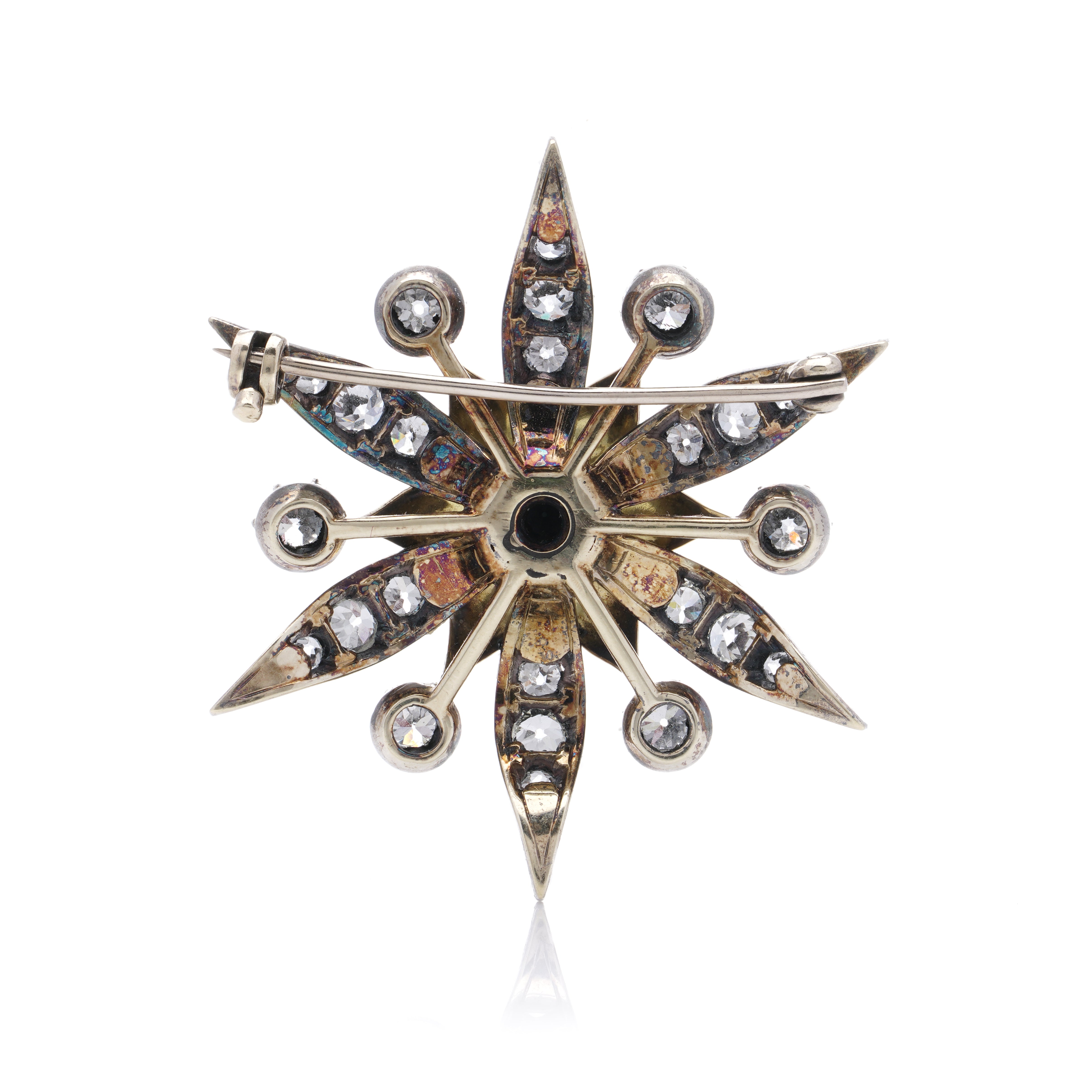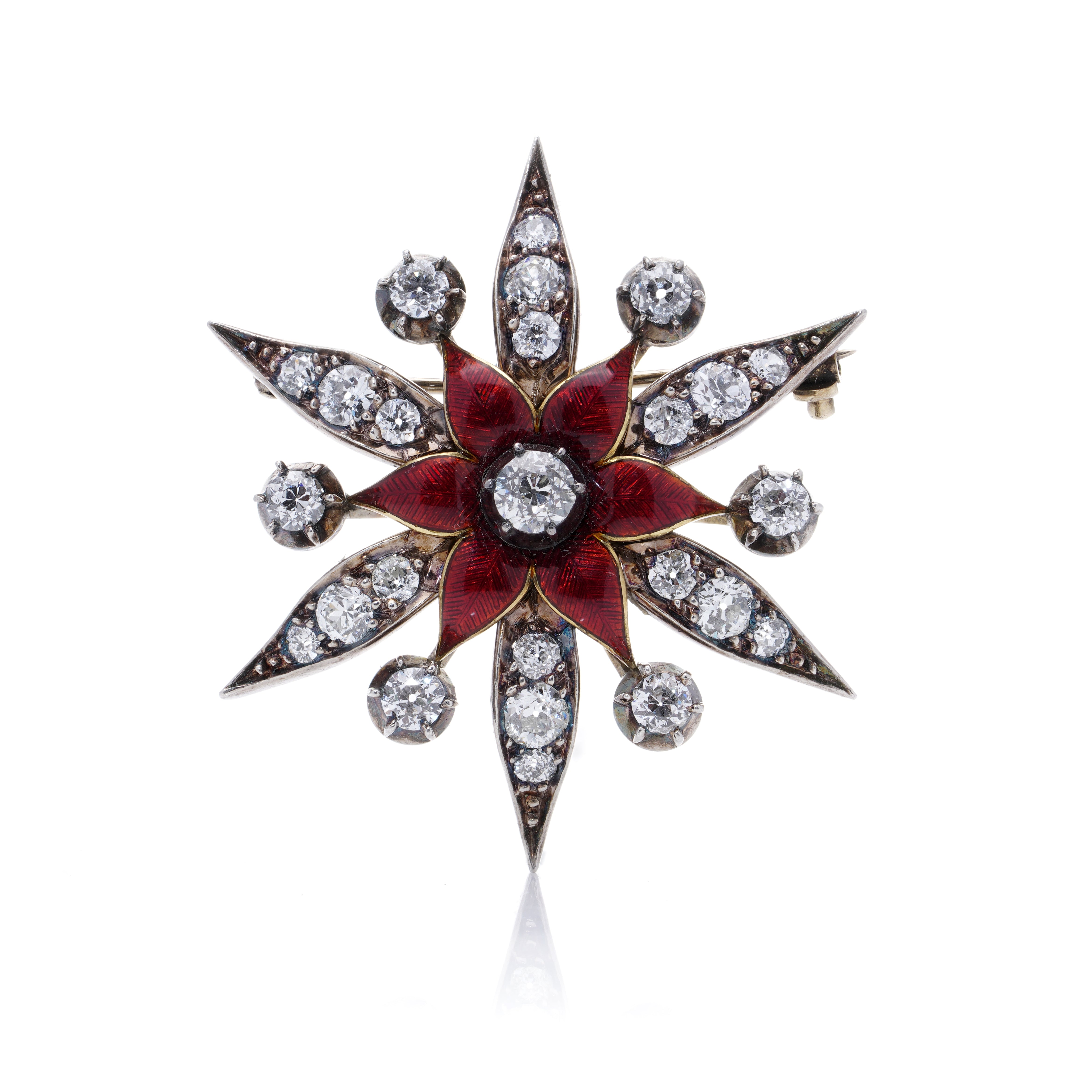 A Victorian diamond star brooch. This beautiful six pointed star is adorned with old mine cut diamonds set in silver on gold. Uniquely for a diamond star brooch, this model has been beautifully detailed with a red enamel centre. This exquisite brooch is fitted with a pin and roller catch safety.