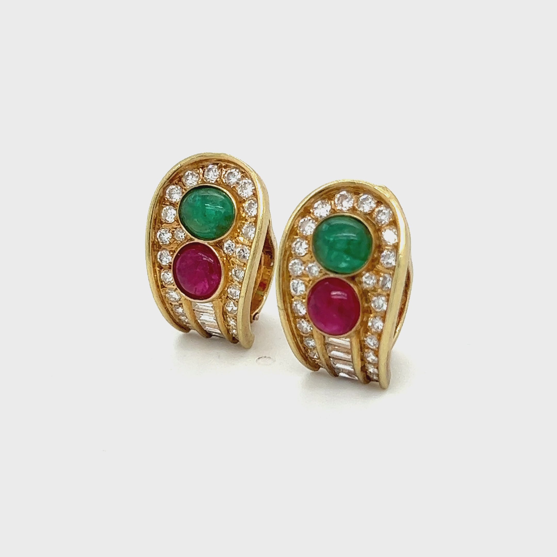 A fine and colourful pair of ruby, emerald and diamond earrings. Each earring is set with a landscape set cabochon emerald to the top and a small portrait set cabochon ruby beneath. Embellishing the colour gems are a row of twenty four brilliant cut diamonds forming the outer edge. The earrings are further embellished with four baguette cut diamonds set to the bottom. Fitted with post and integral clips.