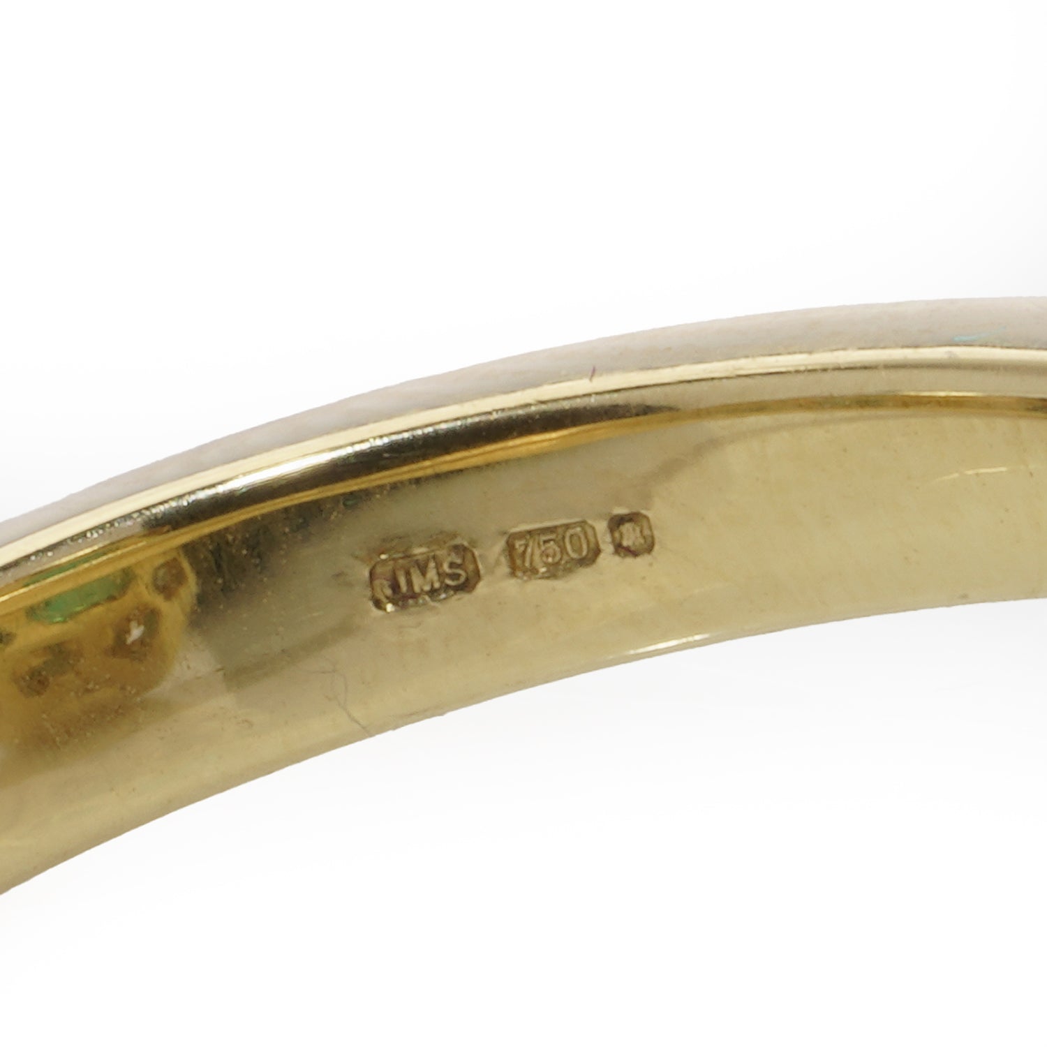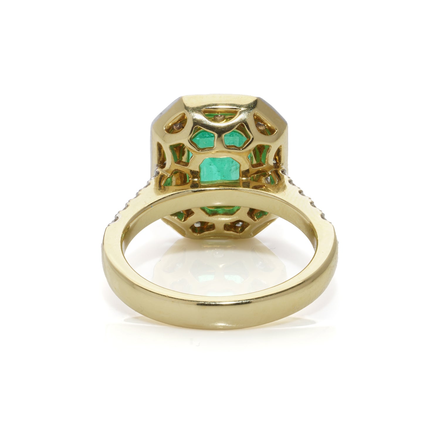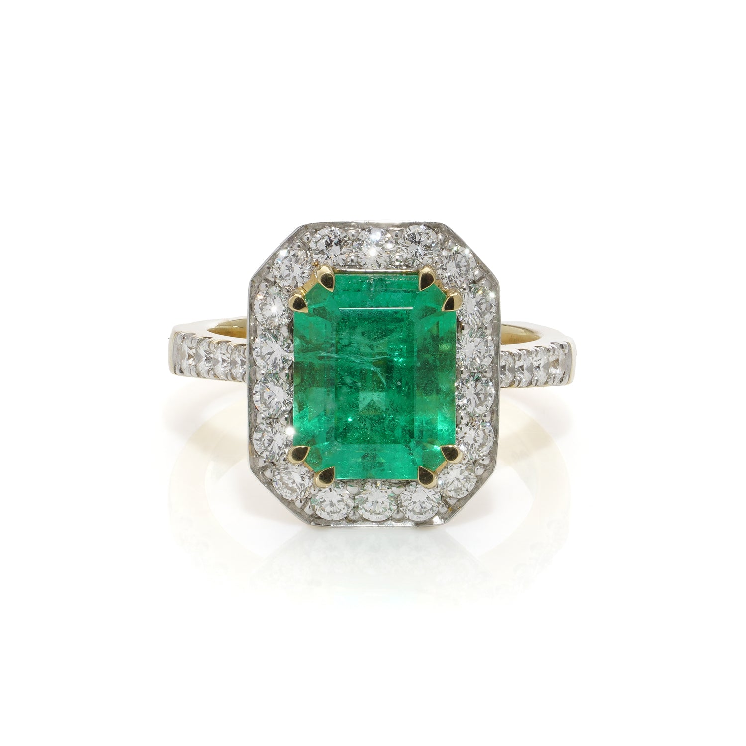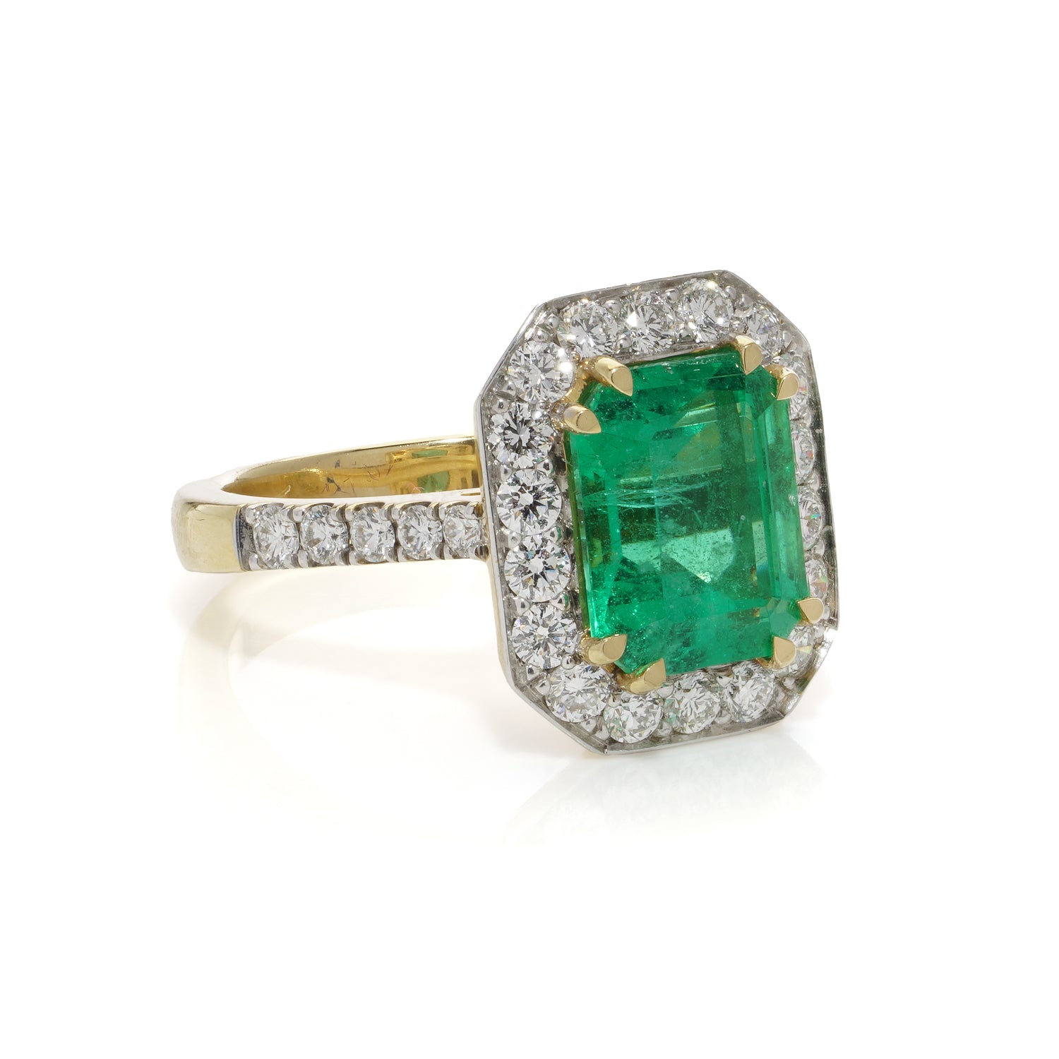 A spectacular emerald and diamond cluster ring. This showstopper of a ring is set with a large emrald cut emerald to the centre in a double talon claw setting of yellow gold. The emerald is surrounded by a border of eighteen speaking brilliant cut diamonds in a contrasting white gold setting. The ring is further embellished with diamond set shoulder in a scalloped setting.