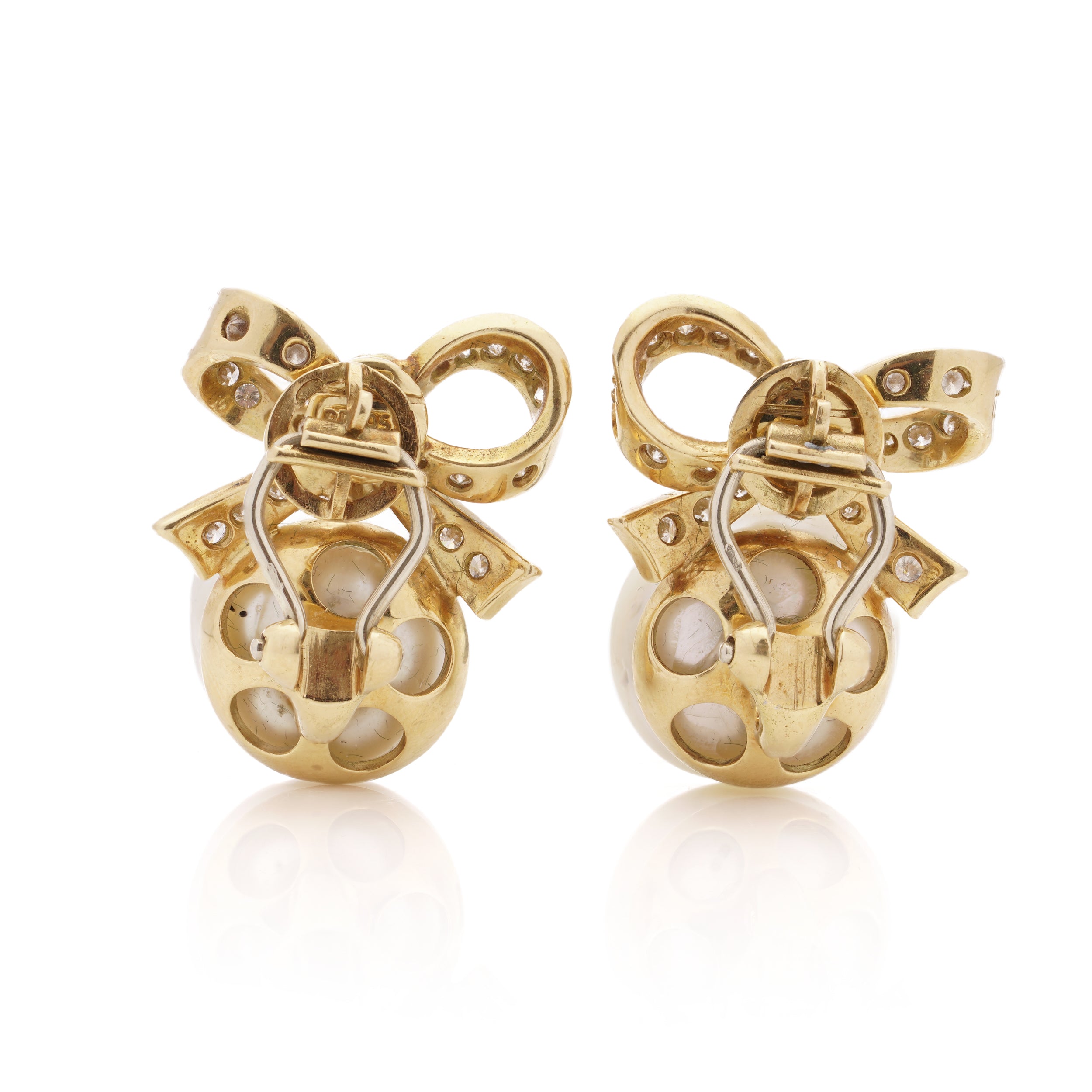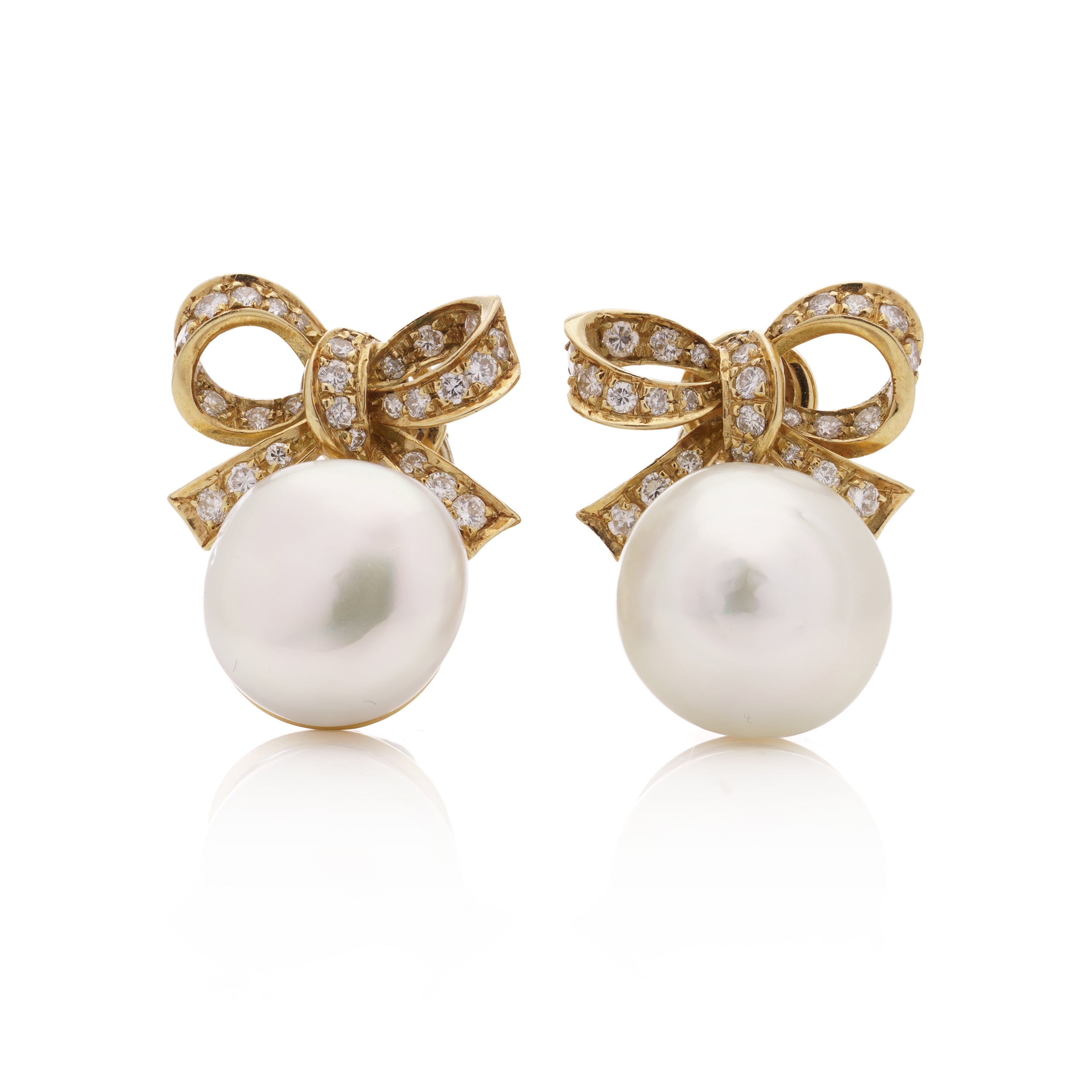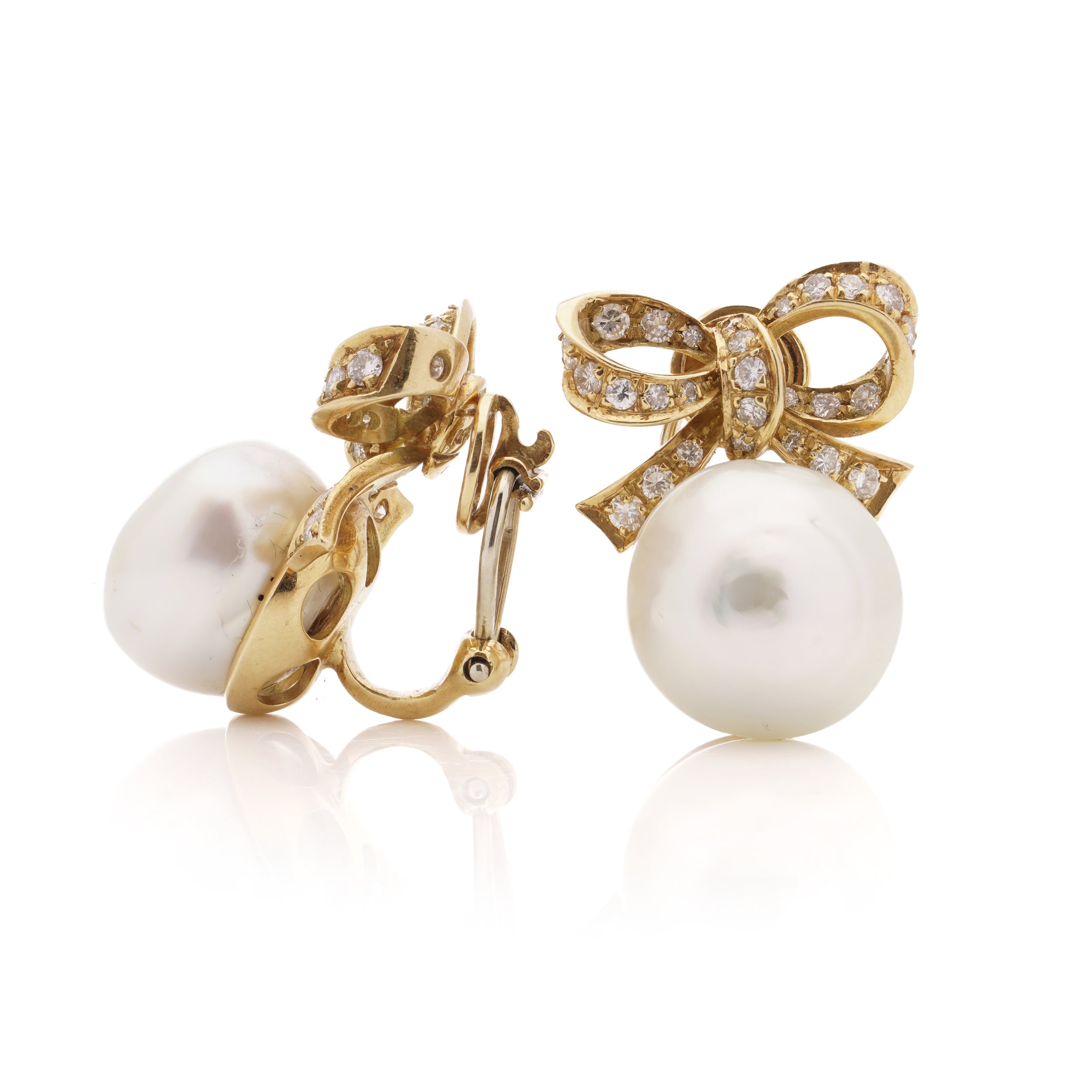 A beautiful pair of sea sea pearl and diamond clip earrings. Each earring is formed of a large white south sea pearl set below a three dimensional diamond set bow motif. Attached to French clip fittings.