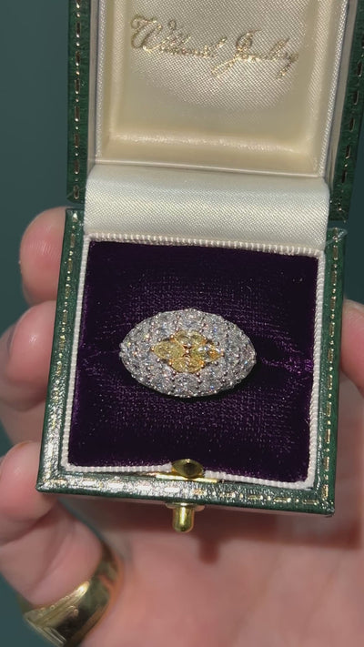 A fabulous yellow and white diamond cluster ring. The ring is beautifully designed with marquis diamonds set in minimalist claw settings. The central four marquis diamonds are fancy yellow and contrast the crisp white diamonds wonderfully.