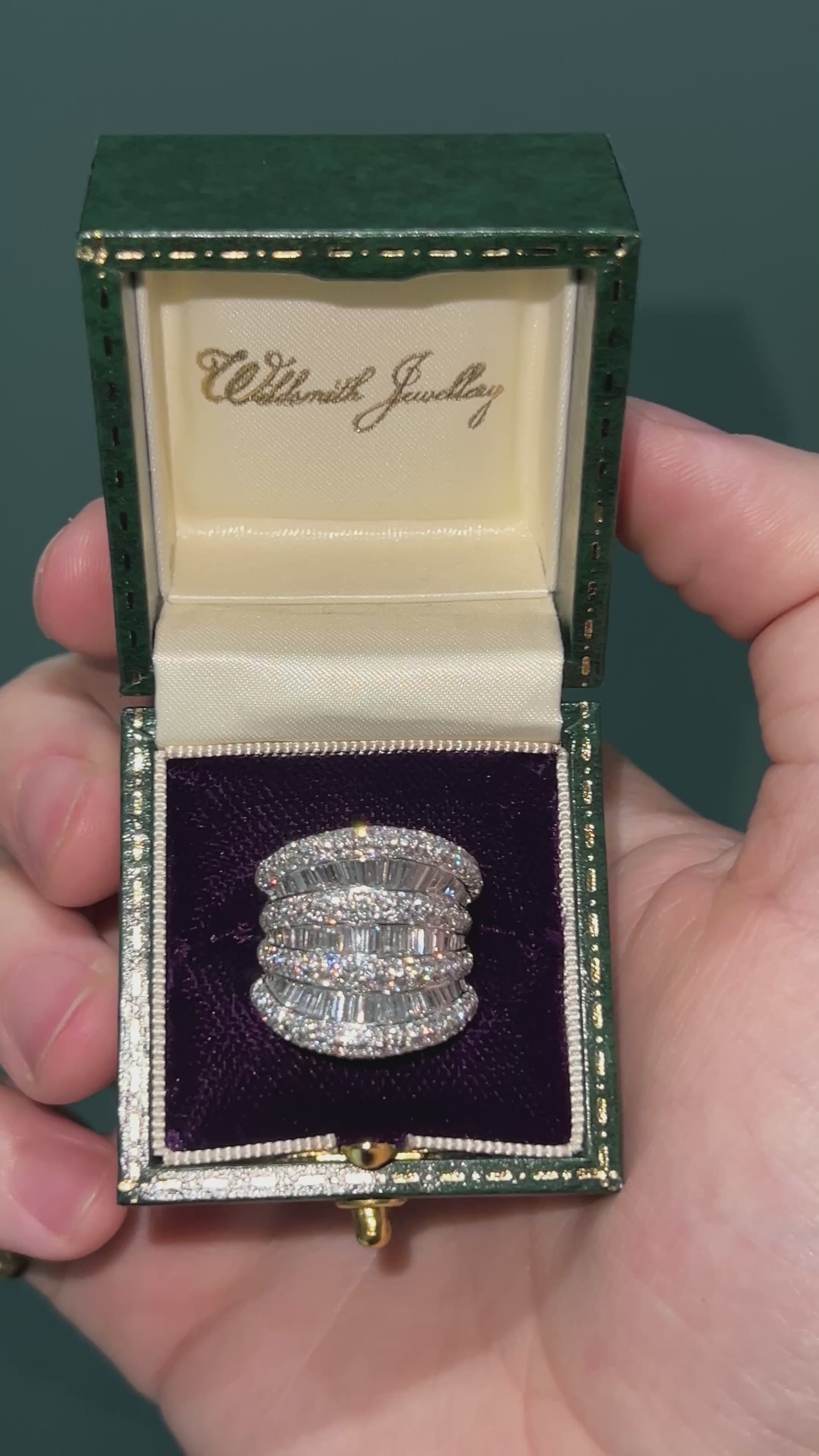 A fabulous multirow diamond dress ring. This showstopper of a ring is set with seven rows of diamonds, alternating from brilliant cuts to baguettes. Concave in its construction, the diamonds throw light at every angle and is the perfect party ring! Made in 18ct white gold, the reverse of the ring has a decorative pattern engraved to the gallery.