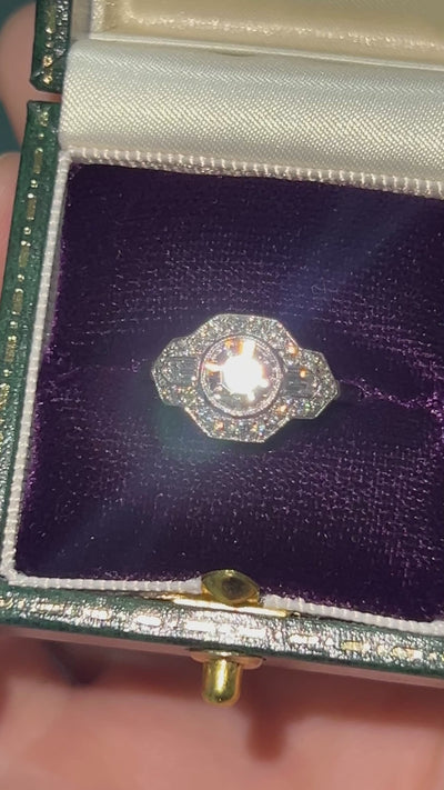 This exquisite platinum engagement ring epitomises Art Deco elegance through its striking geometric composition. A luminous brilliant-cut diamond takes centre stage, secured in a refined rub-over setting adorned with delicate milgrain work. The design is further enhanced by a pair of baguette diamonds positioned on either side, each framed by a constellation of twenty-two brilliant-cut stones that catch and reflect light with captivating brilliance.