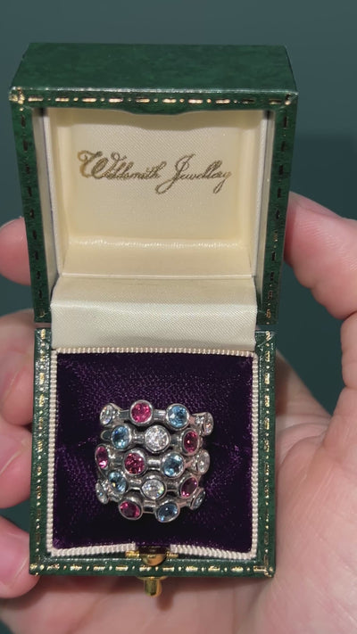 A fun multi gemstone ring set in 14ct white gold. Constructed as five rows with rub-over set diamonds, pink and blue tourmalines. This fun display of colour gem is the perfect choice for adding style and glamour to your jewellery collection!
