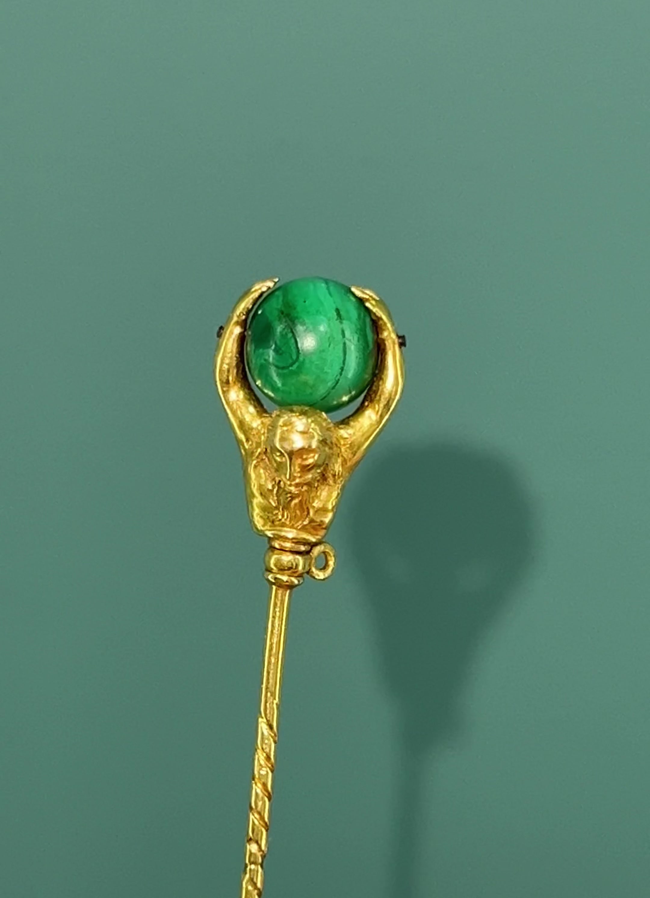 This stunning stick pin is crafted from 22k gold and features a meticulously detailed Atlas figure, proudly upholding a gorgeous malachite sphere in reverence of the heavens. An elegant heirloom piece to be treasured for generations.