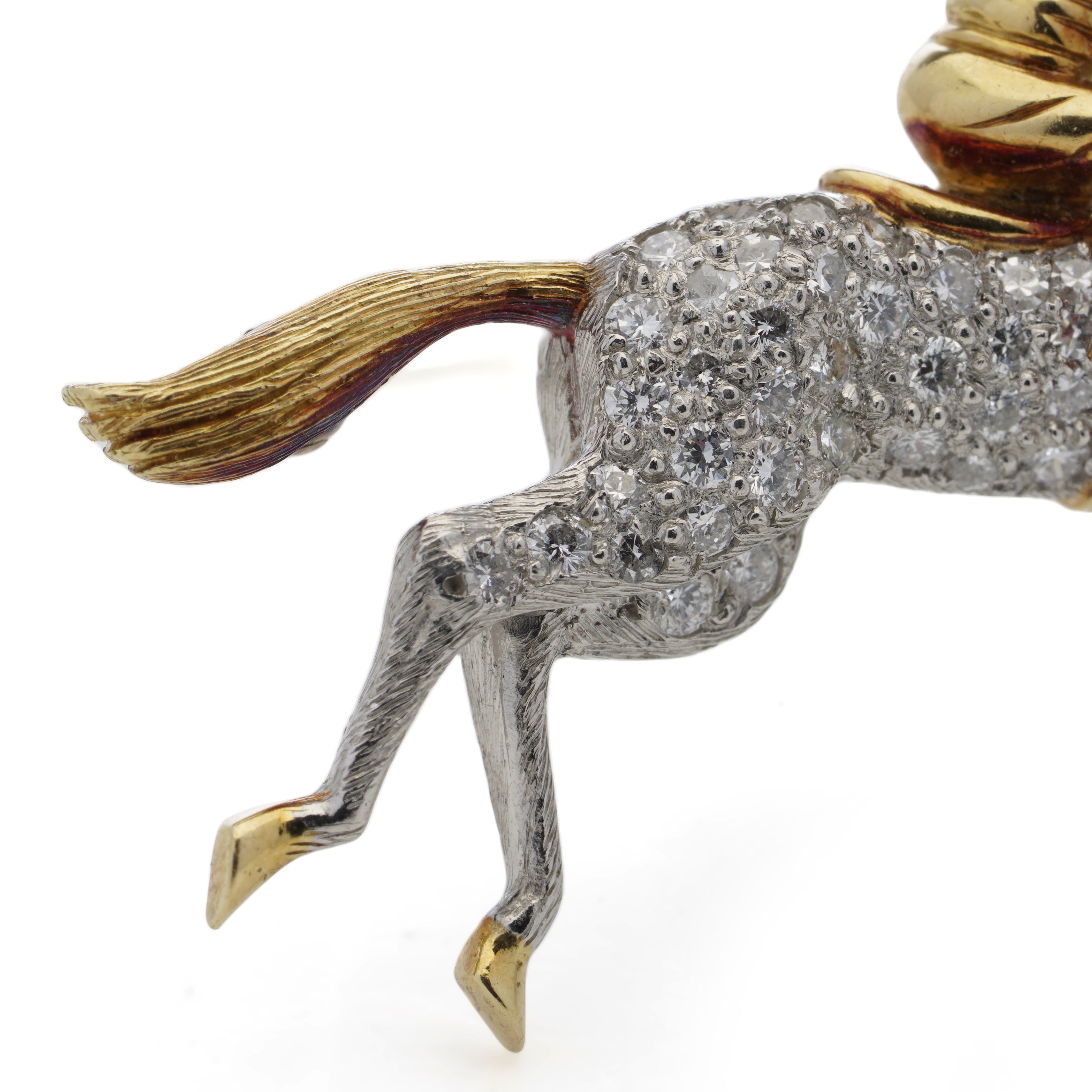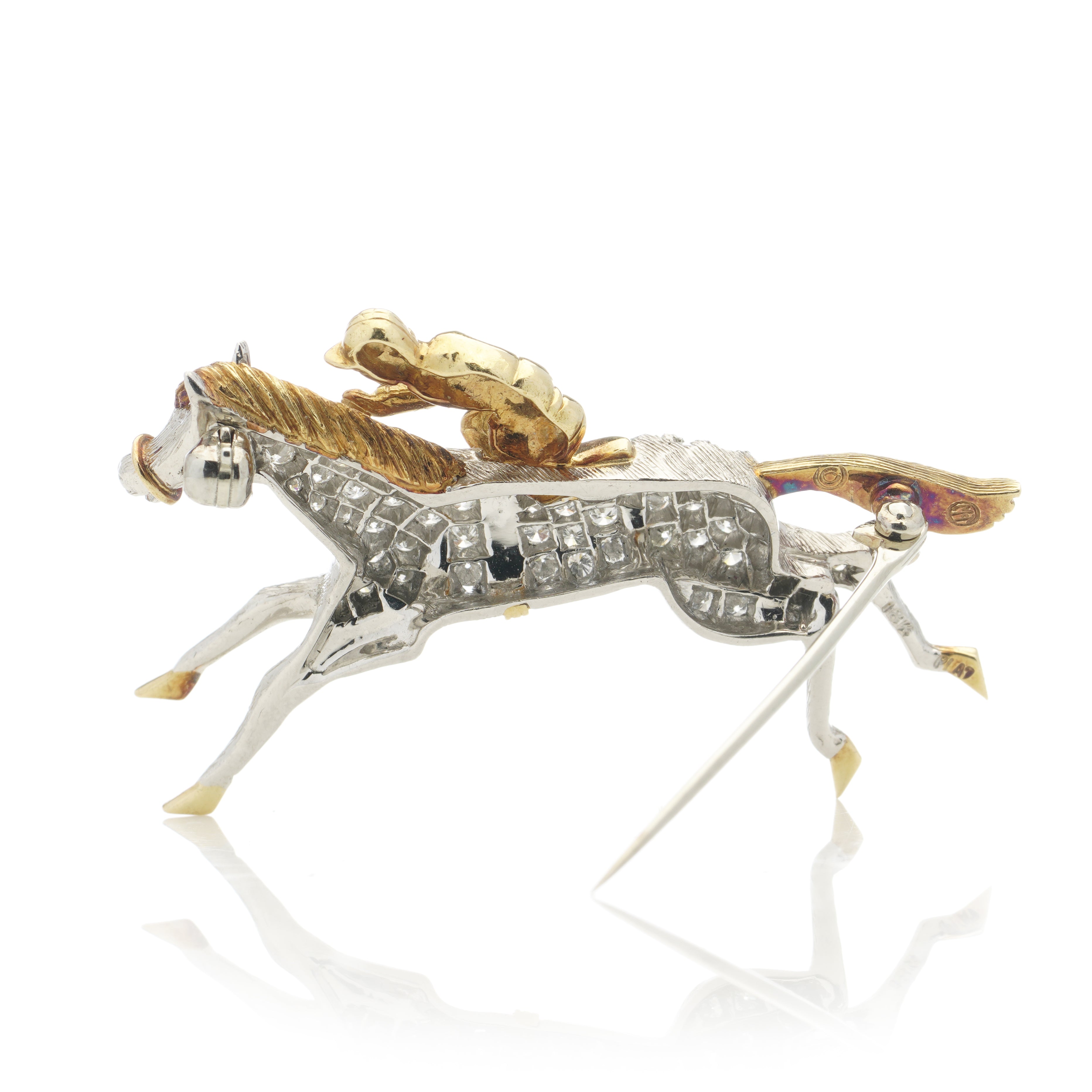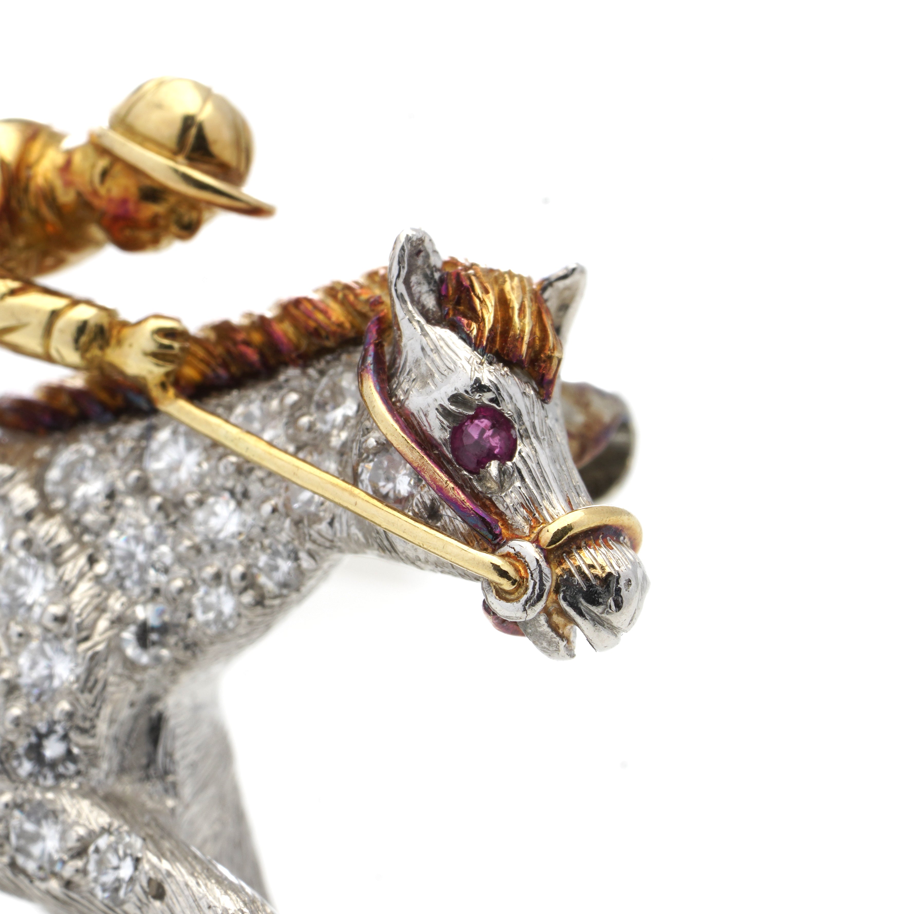 A beautiful horseracing diamond set brooch in platinum and 18k yellow gold. The brooch consists of a horse motif, set with approximately 0.57ct round brilliant cut diamonds predominantly set in platinum with 18k yellow gold detailing on the tail, hooves and mane and a 0.01ct spinel in place of the eye. The rider, saddle and reins are set in 18k yellow gold. The brooch which measures 4cm in diameter, features a pin clasp fastening and has a roller catch.