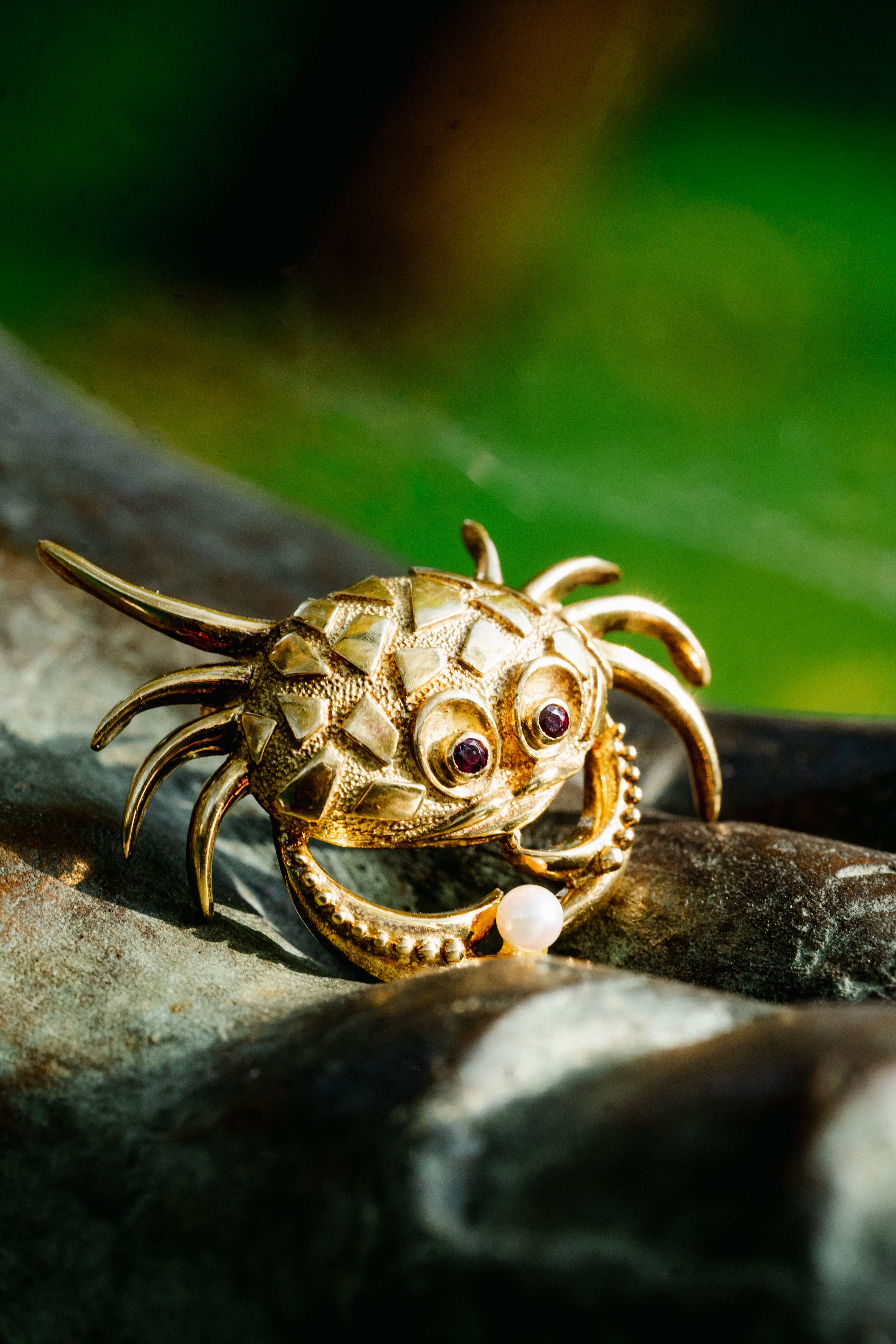 Embrace your Cancer sign with this quirky Zodiac brooch! Crafted with 18ct yellow gold, this crab features sparkling ruby eyes and clutches a stunning pearl between its claws. A playful and stylish way to show off your astrological side!